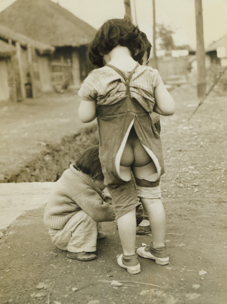 Air Conditioning – Chinese Style, 5/9/1944. Chungking – No, this isn’t a gag. Young Chinese children often wear their trousers this way for the sake of coolness, comfort & convenience. There’s no getting away from it – you can’t beat the Chinese for simple practicality. Credit line – WP – (ACME photo by Frank Cancellare, War Picture Pool correspondent);