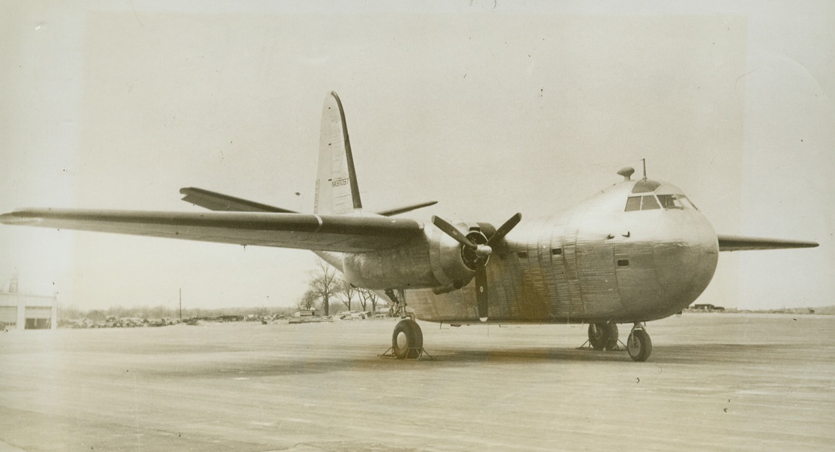 Secret Navy Cargo Plane Revealed, 5/6/1944. Philadelphia, Pa.—This is the new “Conestoga,” super cargo plane so named in tribute to the amazing vehicle which helped pioneer the settlement of colonial territories west of the Alleghenies. The plane, built by the Edward G. Budd Manufacturing Company under Navy contract, is of a brand new type which utilizes welded stainless steel instead of rivoted aluminum alloy sheets. Sixty-eight feet long, this two-engine transport has a wing spread of 100 feet, and is capable of transporting 10,400 pounds of cargo over a range of 650 miles, housing the load in a cargo compartment 25 feet long, eight feet wide, and eight feet high wholly unobstructed by girders or other structural members. Credit: ACME.;