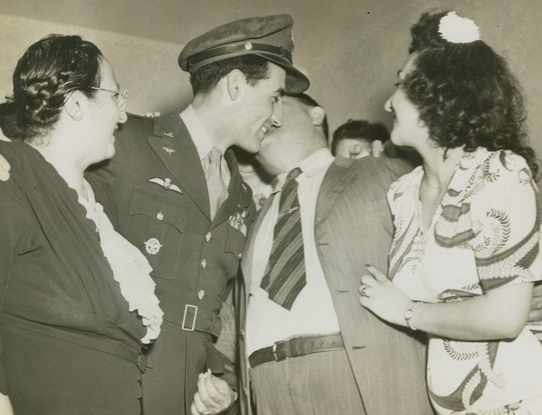 Put It There, Dad, 5/22/1944. Piqua, O. – Patsy Gentile, father of the famed American Ace Don Gentile who downed 23 Nazi planes in combat and shot seven on the ground, gave his son a warm welcome as he returned home on furlough. Mrs. Gentile and Don’s sister Edith made the reunion complete in Piqua, O. Credit: ACME;