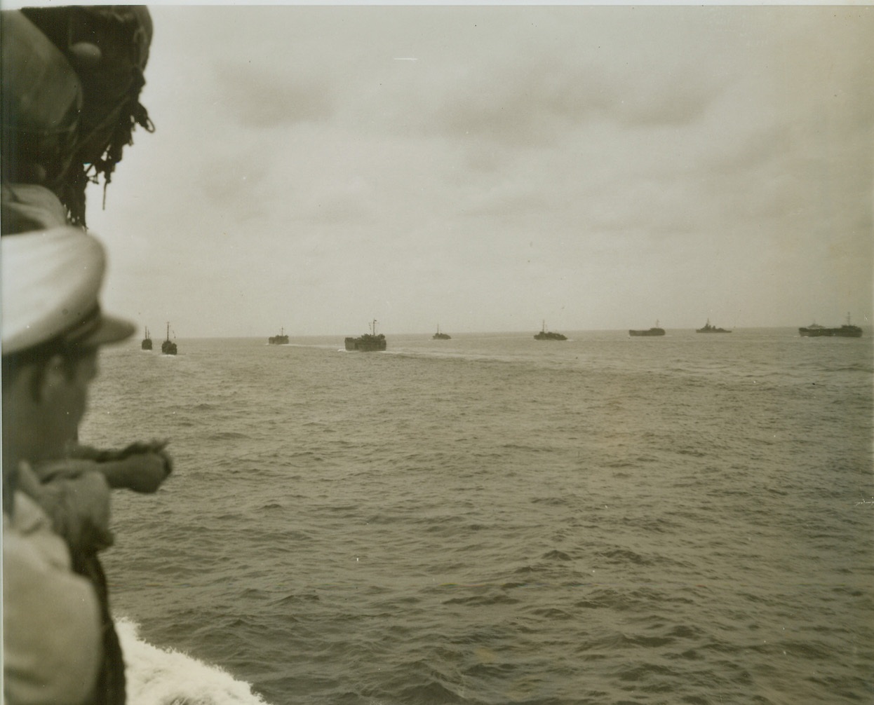 PART OF HOLLANDIA INVASION FLEET, 5/3/1944. DUTCH NEW GUINEA – As far as the eye can see, craft of the huge Allied invasion fleet which Hollandia, Aitape, and Tanamerah Bay, dot the surface of the sea as they head for the Dutch New Guinea coast. In the foreground, men aboard one of the ships relax in the warm sun, enjoying the last few moments before the attack. (Passed by censors.) Credit: ACME photo by Thomas L. Shafer for the War Picture Pool;