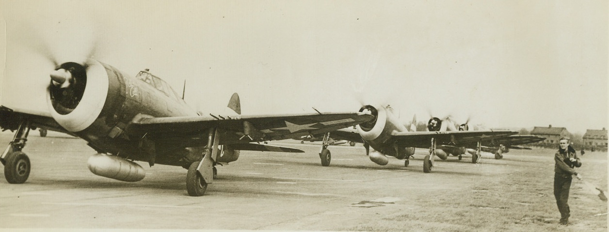FLAGGING MEN OFF, 5/7/1944. SOMEWHERE IN ENGLAND – Lt. H.W. Collins, Army Air Forces pilot from Atlanta, GA., flags off a group of thunderbolt dive bombers as they set out on a mission over Louvain, Belgium. Pilots at the station take turns flagging the planes off as they roar out to smash airfields, cut communications and knock out Nazi batteries in preparation for the coming invasion of Western Europe.Credit: Acme;