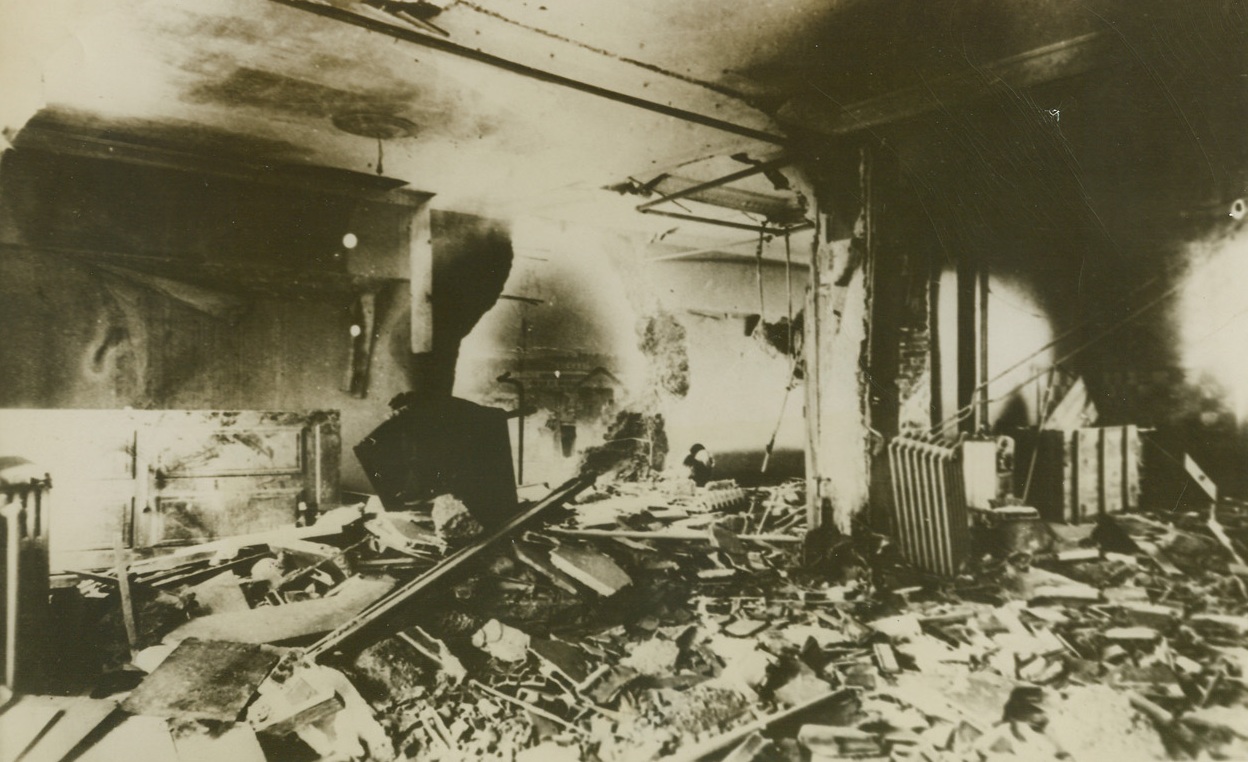 Infamous Meeting Place Blasted, 5/31/1944. GERMANY — Aircraft of the R.A.F. Bomber Command attacked Munich on the night of April 24/25 completely destroying the Residenz, a group of buildings used by the Nazi Party as a meeting place. This picture taken after the RAF attack shows the Residenz, previously damaged, now completely gutted. At the bottom center is a smaller block of buildings which was also used by the Nazis. Most of the roofs of this small block have collapsed. Credit Line (ACME);