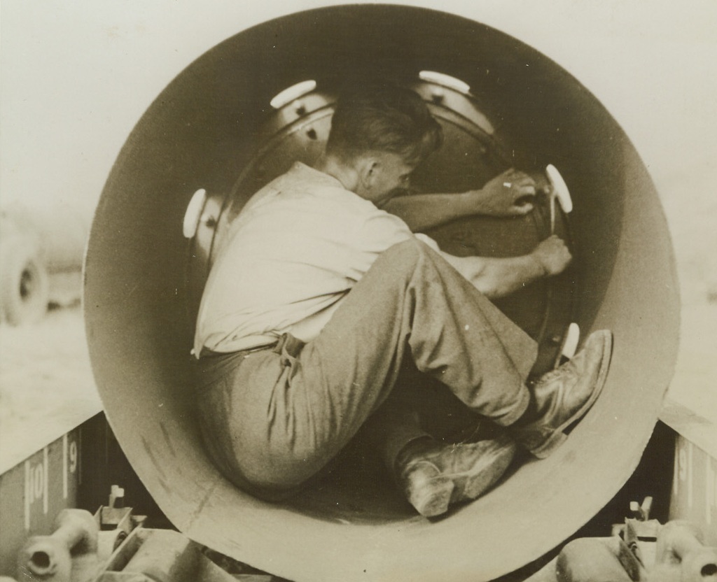 He’s Playing with Dynamite!, 5/8/1944.England – This armourer is working in close and dangerous quarters as he makes adjustments inside the fin of an 8,000-pound bomb. Night after night, these famous “blockbusters” of the RAF bomber command screech earthward from RAF bombers over enemy territory. German industrial and transportation centers have been almost impossibly crippled by these devastating raids. Daylight follow-ups by the AAF smash at vital enemy points. Credit: ACME;