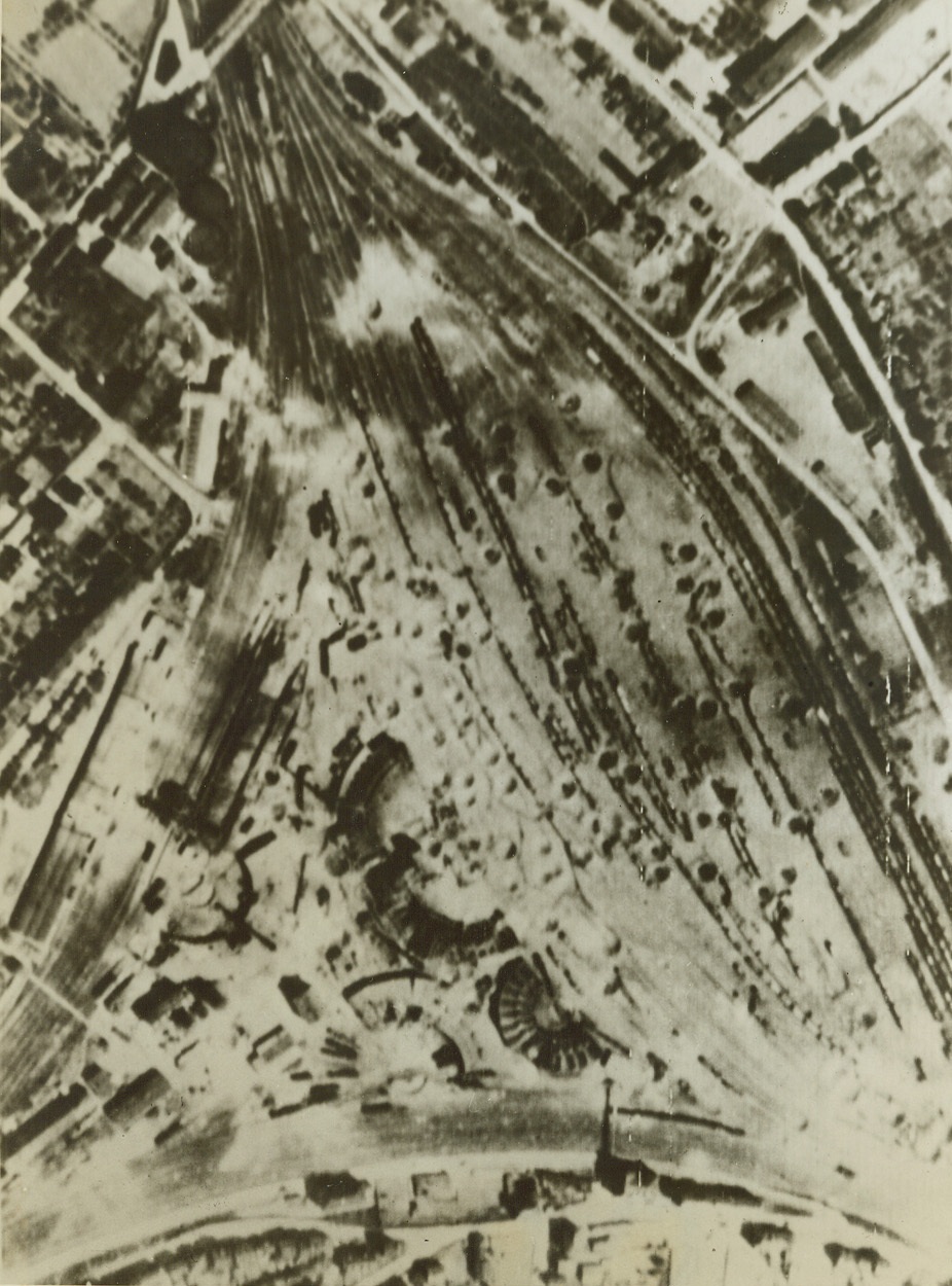 More USAAF Precision Bombing, 5/6/1944. Metz, France – These railroad yards at Metz are pitted with bomb craters following another raid by U.S. Flying Fortresses and Liberators on May 1. Faultless precision bombing resulted in direct hits on tracks, rolling stock and roundhouses at the yards—heavy blows to the already crippled German transportation facilities. Metz was just one of six Nazi rail yards hit by U.S. planes on the afternoon of May 1. Passed by censor. Credit: Signal Corps photo from ACME;