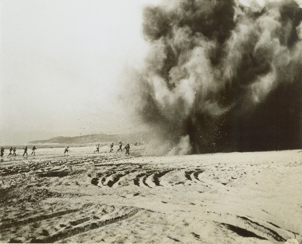 Practice Makes Perfect, 5/5/1944. England – Dodging shell bursts as they rush across the sandy beach, these American infantrymen go through some rugged training for the coming invasion of the continent. Working under realistic conditions, amphibious forces land on the beach and storm “enemy” beach defenses amid explosive charges which simulate enemy artillery bursts and bombing. Working on the theory that “practice makes perfect,” amphibious maneuvers of this type are being conducted throughout England. Credit: Official US Army photo from ACME;