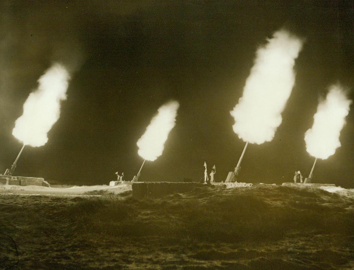 Martian Pattern Paints Luftwaffe Doom, 5/29/1944. Camp Davis, N.C. – A battery of 120MM. anti-aircraft guns, firing simultaneously during night practice at Camp Davis, N.C., create weird patters of light – Designs for the destruction of Hitler’s Luftwaffe. The gun has a vertical range higher than any other anti-aircraft gun known in use. It has been dubbed the “Stratosphere” gun as shells fired actually do go that high. 5/29/44 (ACME);