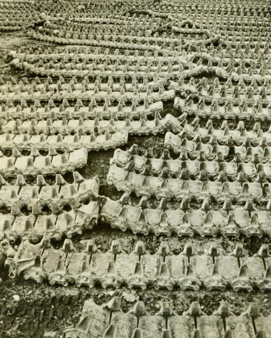 New “Life” For Damaged War Vehicles, 5/2/1944. Fort Lewis, Wash. – The casualties in vehicles and other equipment in this highly mechanized war, is high. But, shattered steel and machinery is not left on the battlefield to rust and much of it is rebuilt and put back into action – Very little is wasted. At the U.S. Army’s Mount Ranier Ordinance Depot, one of the many such depots in various parts of the country, combat, and service and transport vehicles are repaired, reclaimed, or salvaged. Here, the vehicles, collected in the far-flung battle areas of the World, roll in from ports of embarkation on flat cars. They are unloaded and classified and machines which can be repaired to a degree that will restore them from 95 to 100 per cent as efficient as when new, will be rebuilt and returned overseas. Those which can be repaired but not to as high a degree of efficiency, will be shipped out to training centers, and those beyond repair will be dismantled for salvageable parts. What is left over will be sold for junk and will find its way back into the war effort through scrap. This series of photos, made at the Mount Ranier Ordinance Depot, adjacent to Fort Lewis; shows how damaged vehicles are “given new life.” Stripped from tanks on the battlefield, these tank tracks will be reclaimed at the depot shops and then sent back into action. 5/2/44 (ACME);