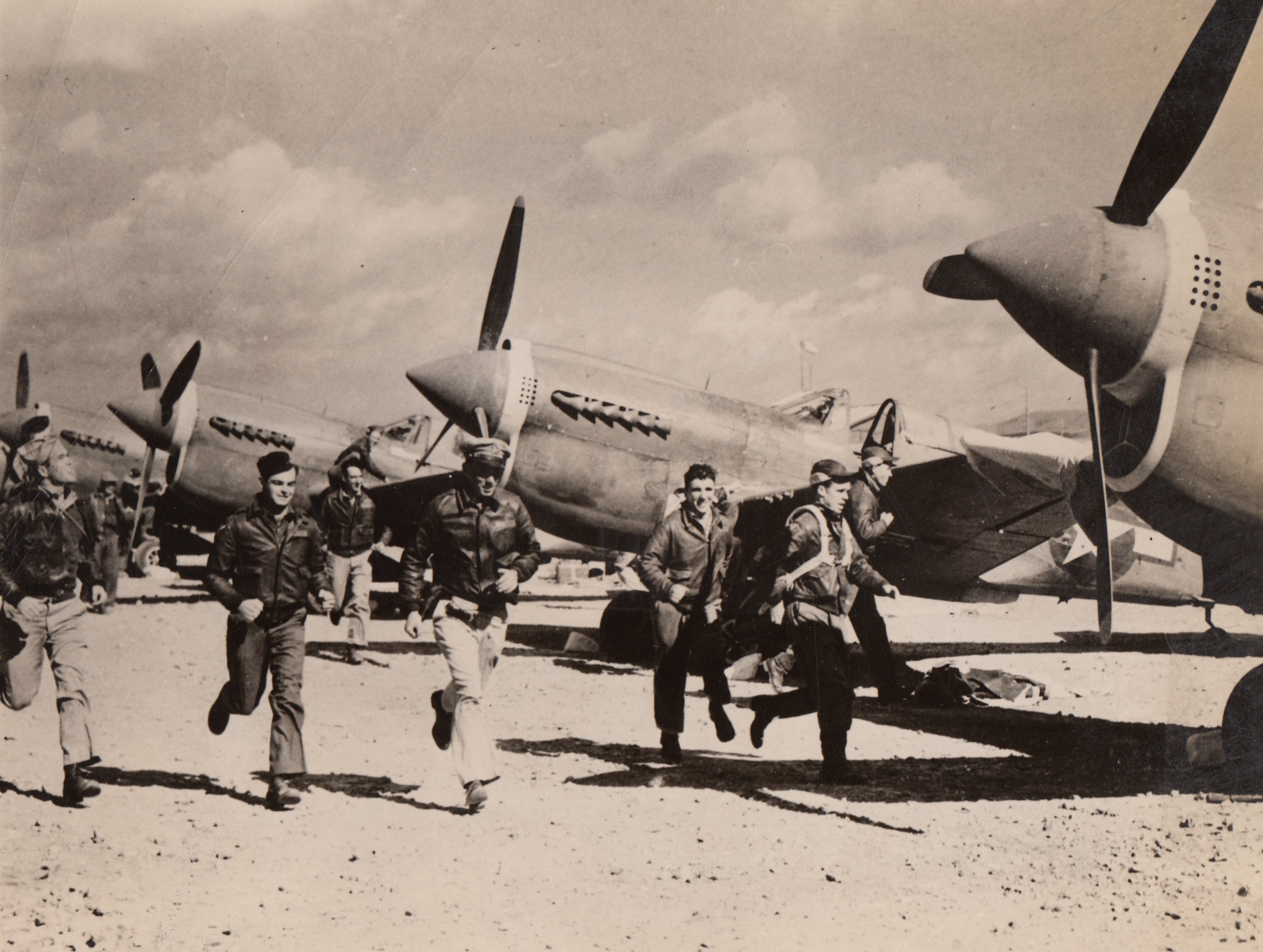 “Jing Bow! – Jing Bow!”, 5/9/1944. Somewhere in China – Here is a typical scene at a U.S. 14th Air Force base somewhere in China. As the cry “Jing Bow!” (Air raid in Chinese) echoes through the area. As soon as the signal is given “Flying Tiger” pilots hurry toward their planes, ready to go up after the enemy raiders. 5/9/44 Credit Line (Official U.S. Army Photo From ACME);