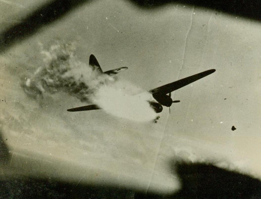 Death Dive For Jap Plane, 5/28/1944. Central Pacific – Flame streams backward from burning motors as this Jap bomber starts its death dive into the sea, the bomber was the victim of a surprise attack by a Nay Coronado Flying Boat of the Fleet Air Wing 5/28/44 (US Navy Photo From ACME);