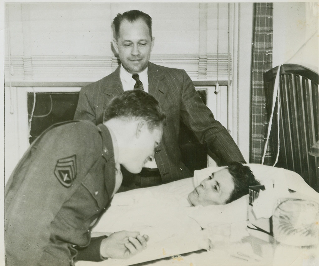 Gunner Flies Home to Mother, 5/6/1944. Poplar Bluff, MO.—Mrs. Mary Pauline Dodd, critically ill in a hospital in Poplar Bluff, MO., greets her son, Staff Sgt. Everett L. Dodd, a tail gunner in a flying fortress, who arrived at her bedside after a 20-hour Atlantic crossing from an American air base in England, where he was given permission to return to the United States because of his mother’s illness. Mr. Dodd, center, looks on as mother and son are reunited. Credit: ACME.;