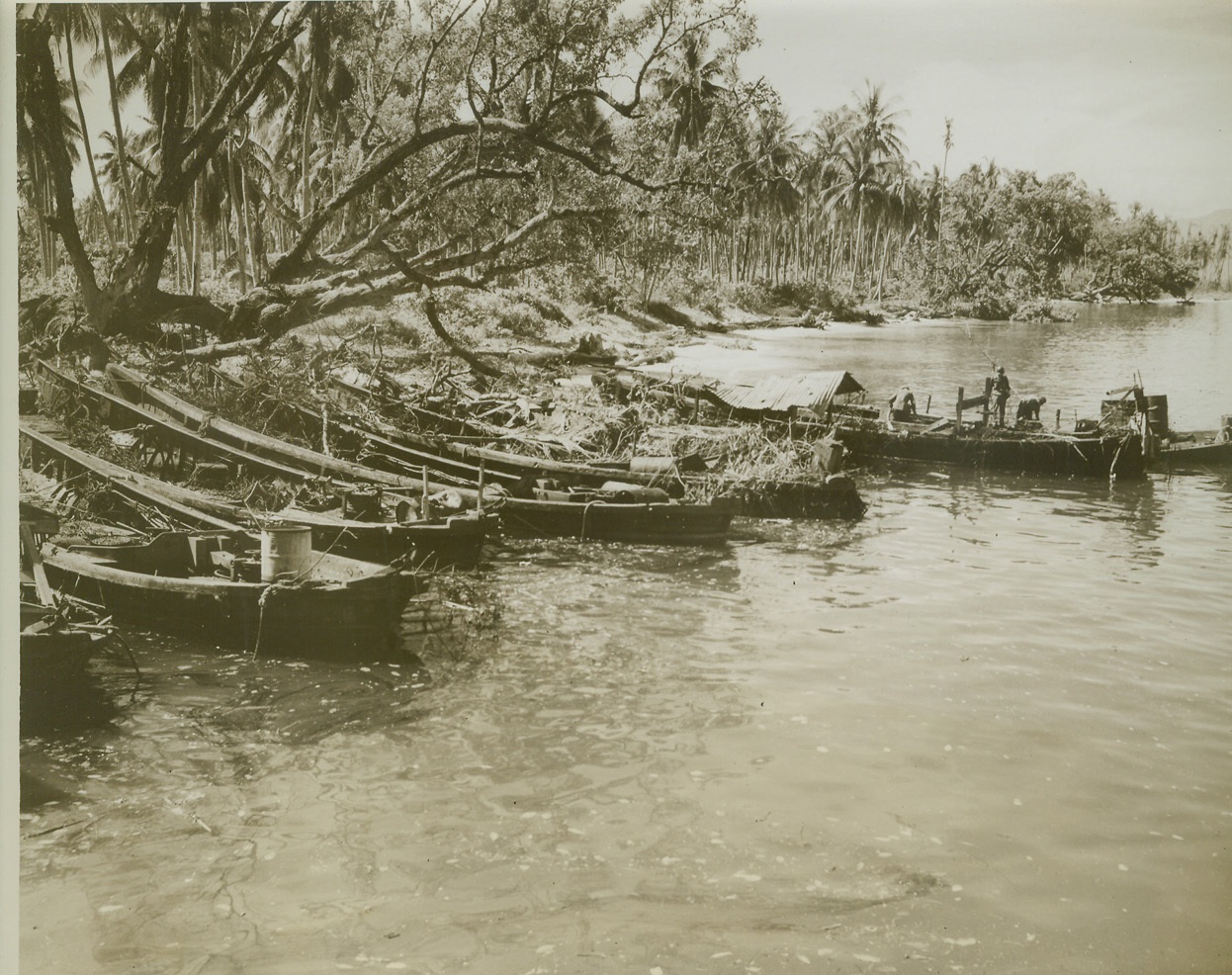 JAP BARGES BURNED OUT BY BOMBARDMENT, 5/3/1944. DUTCH NEW GUINEA – U.S. troops (right) look over Jap barges on Selso Island, burned out under shelling by Allied warships. The island is one of three in Aitape Harbor attacked during the invasions of Dutch New Guinea. (Passed by censors.) Credit: ACME photo by Thomas L. Shafer for the War Picture Pool;