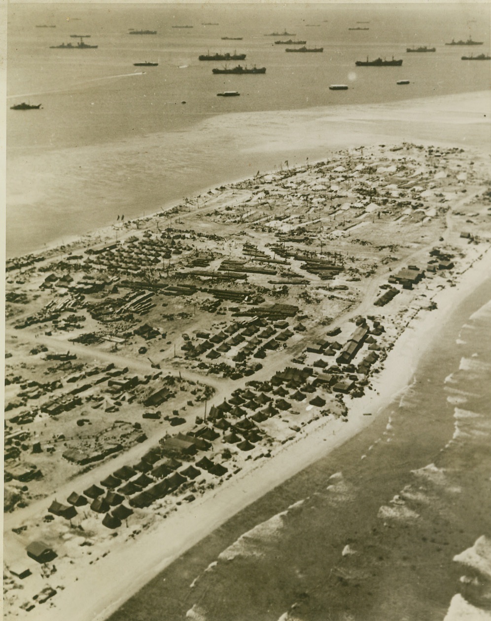 YANKS REBUILD KWAJALEIN, 5/2/1944. KWAJALEIN – This aerial view of newly-conquered Kwajalein Island in the heart of the Marshalls Group shows how the U.S. Navy Task Force is at work rebuilding the shell-shattered base. Rows of tents house Seabees, whose skillful efforts have already partly removed the pock-marks of war on the Atoll. Part of the Navy Task Force can be seen anchored offshore. Credit: U.S. Navy photo via OWI Radiophoto from ACME;
