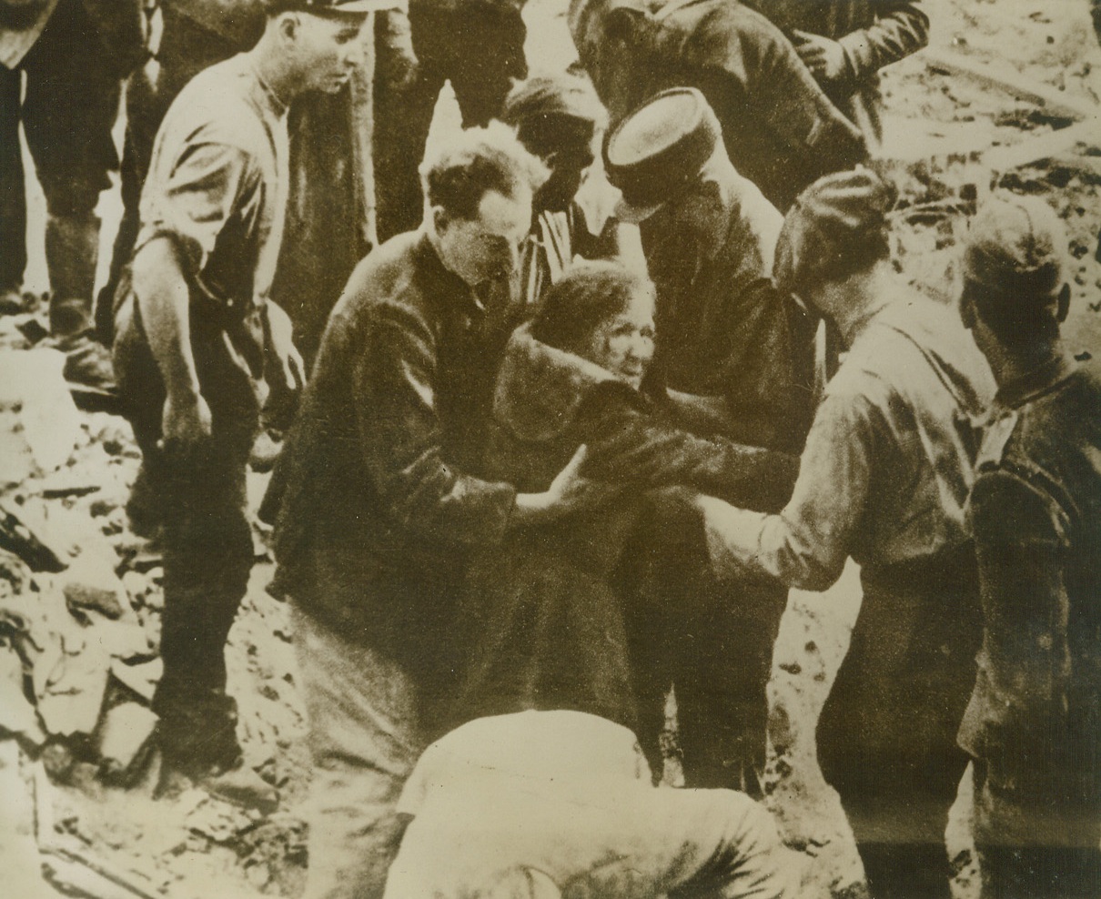 Invincible Berlin?, 5/19/1944. BERLIN GERMANY – When Goering boastfully proclaimed that the allies would never bomb Berlin, he reckoned without the forcefulness and persistence of the RAF and the USAAF. Recent raids by the two air forces have reduced the German Capital to shambles, and given to the Nazis a return engagement of the Blitz with which they so heartlessly pounded London. Here, an aged German woman struggles out from a shelter after an allied raid on Berlin, and is helped as she makes her way through the wreckage of what was once a Berlin thoroughfare.Credit: ACME;