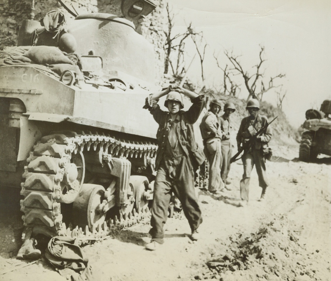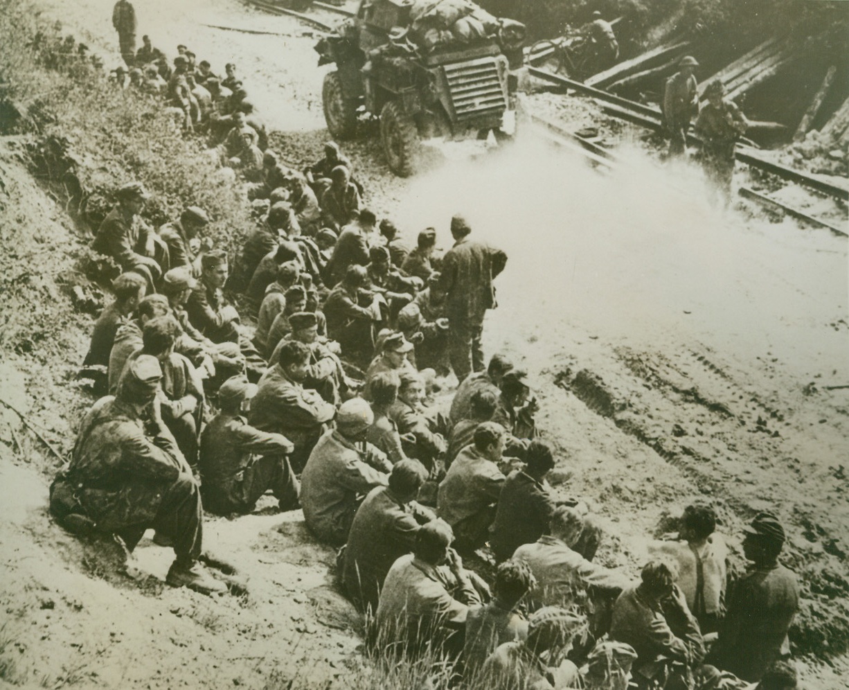 Nazis Get Time Out, 5/25/1944. ITALY – Unlike the infamous “March of Death” American soldiers captured in the Philippines were subjected to, these Nazi prisoners of war get a chance to rest along an Italian road as they are herded to the rear lines and PW compounds. Allied armored vehicles pass the Nazis on their way to reinforce the frontline troops. Thes prisoners are some of the huge haul taken in the early stages of the drive against the Gustav Line by the Allied Fifth and Eighth Armies.Credit-WP-(ACME);