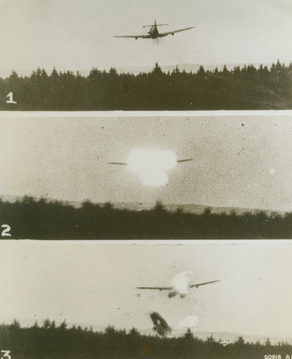 FIERY FINISH FOR NAZI, 5/24/1944. In these remarkable photos taken by the automatic camera gun of the attacking American fighter of the Eighth Air Force, a German ME-109 pursuit plane is shown meeting a flaming end under the guns of the Yank. At the top, the enemy plane roars along at treetop level in an effort to escape. Center, the ship bursts into flame as American guns register, and, at bottom the fiercely burning plane starts to disintegrate before crashing to earth.Credit: U.S. Army photo from Acme;