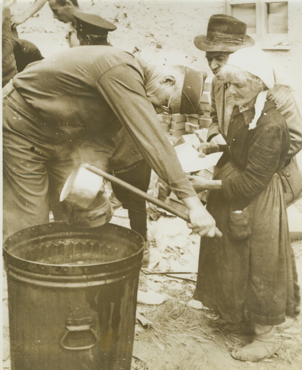 Italians Come Home, 5/31/1941. Italy – Italian civilian refugees have returned to Minturno after the Allied occupation of the town. Here an official of the Allied Military Government doles out soup for an old woman after examining her papers. Credit – WP – (ACME);
