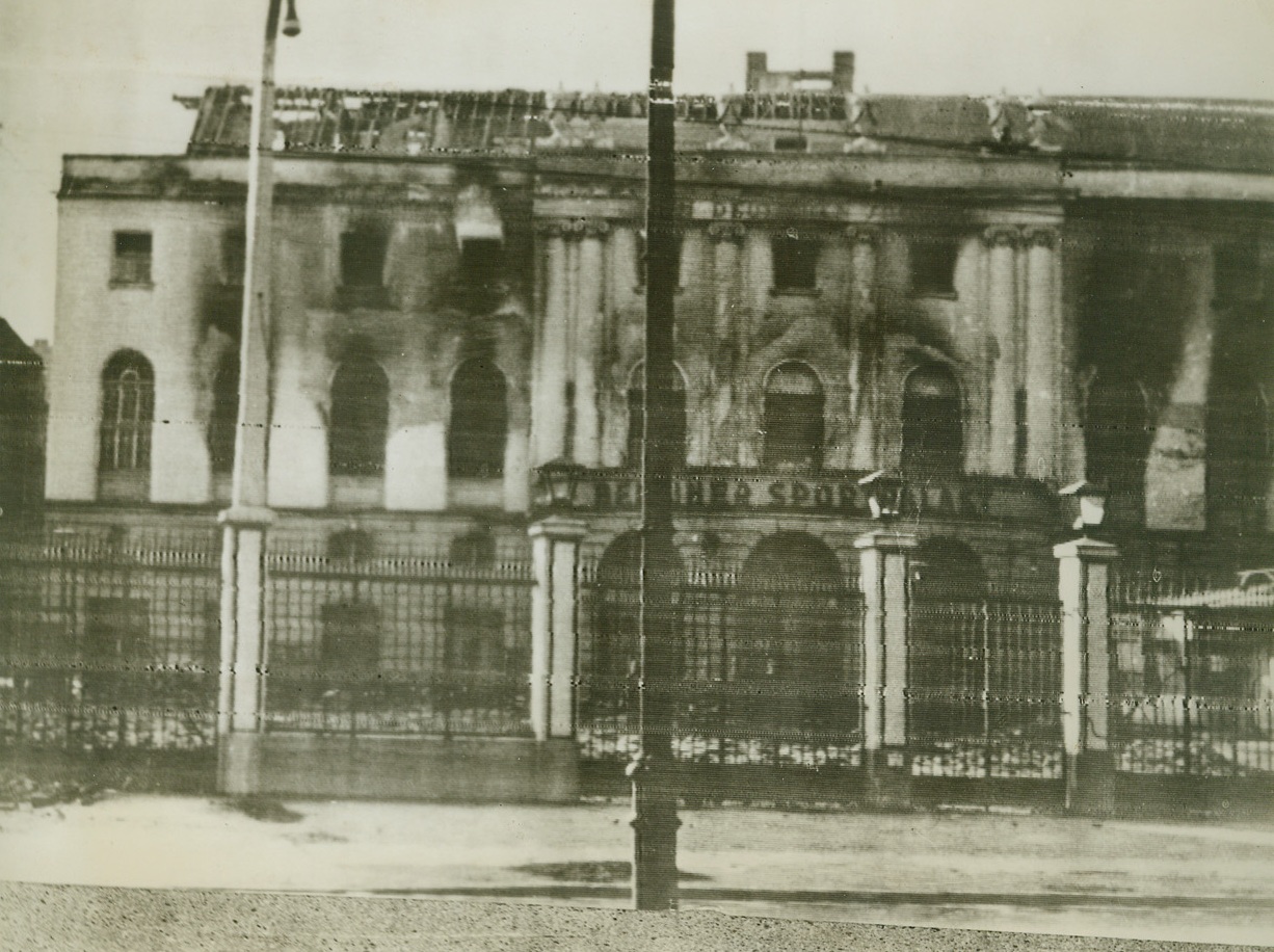 NO MORE HEIL-ING HERE, 5/19/1944. BERLIN, GERMANY—This photo, received by radio from a neutral source, shows the Berlin Sportpalast, home of the famous “Heil, Hitler” speeches, merely a shell left standing after a recent Allied attack on the German capital. It was in this stadium that the youth of Germany gathered to pay blind homage to their Paperhanger Dictator.Credit: Acme;
