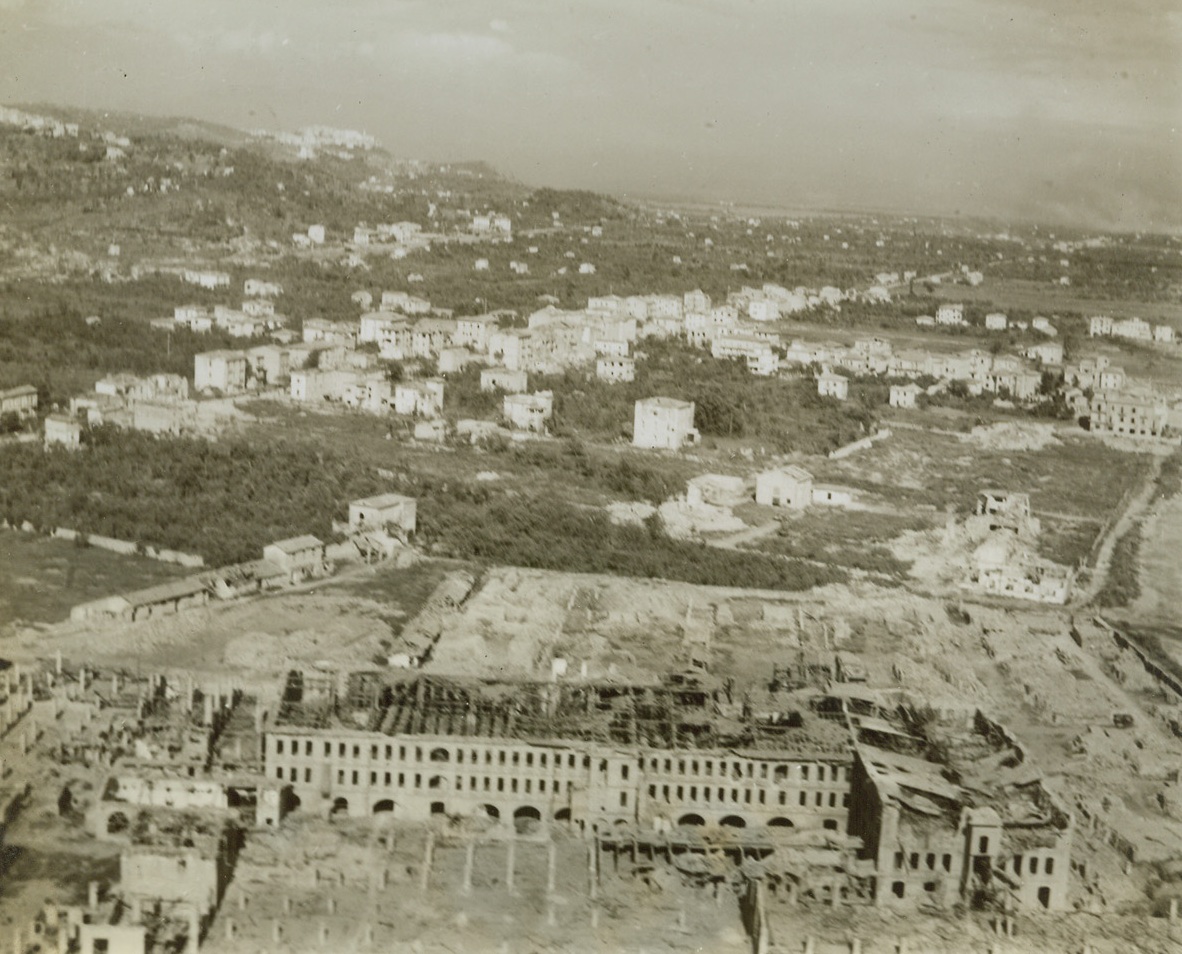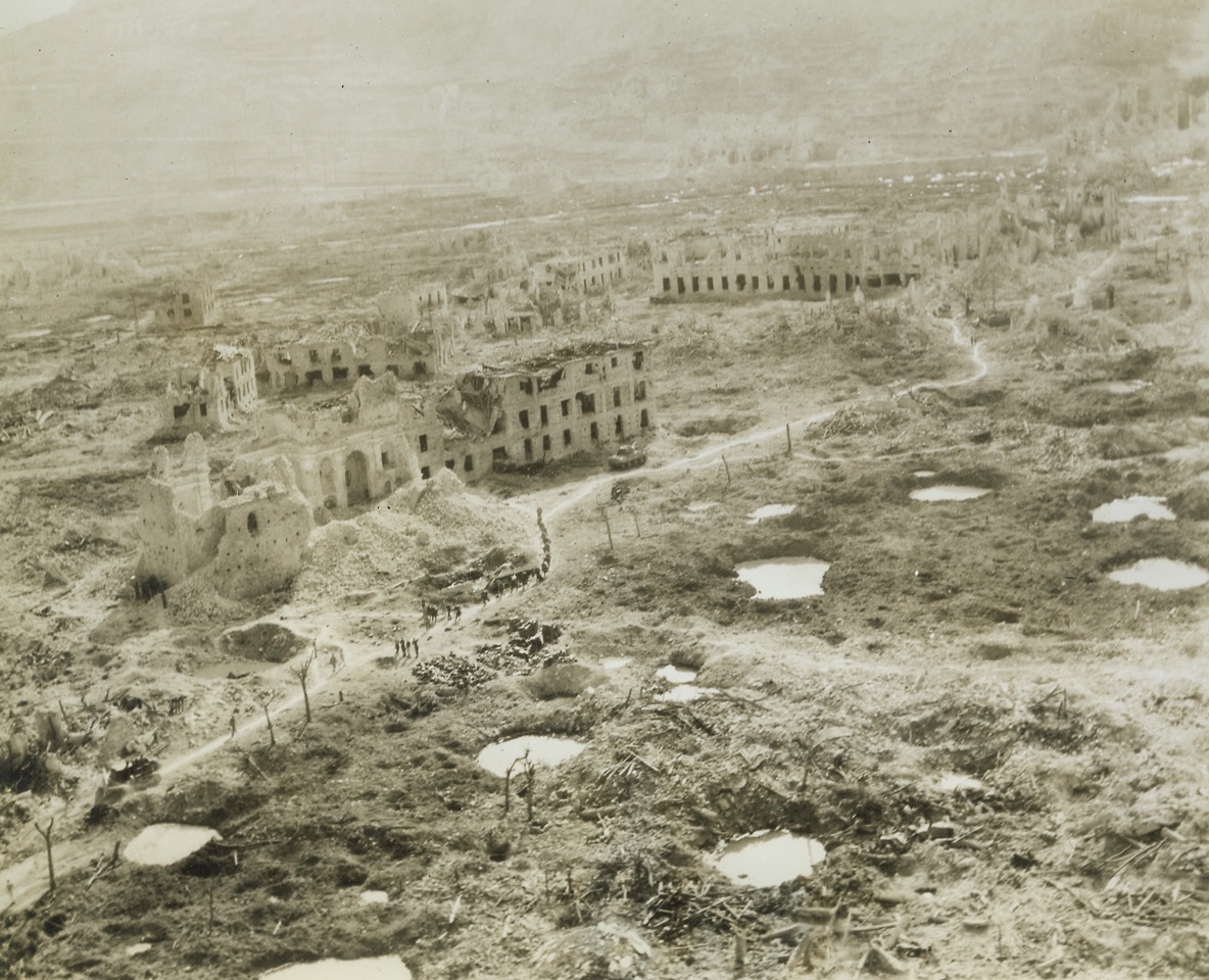 Ghost Town, 5/24/1944. CASSINO, ITALY—Here’s the entrance to Cassino from Route 6. The first building at the left in a bombed-out, while others are not identifiable. Only broken walls remain after virtually a four-month siege during which time countless rounds of artillery fire were poured into the town and thousands of tons of bombs were dropped on the German stronghold of the Gustav Line. Credit: ACME photo by Charles Seawood, War Pool Correspondent.;