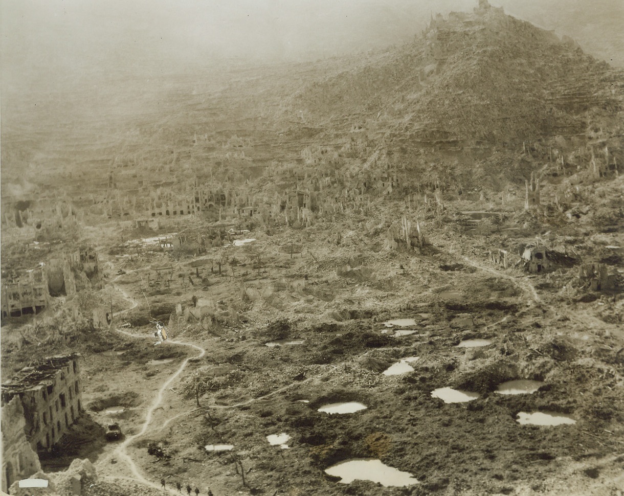 The Aftermath, 5/26/1944. CASSINO, ITALY—Allied bulldozers clear the road between the mountains of rubble that was once Cassino, as Army engineers work to repair the highway leading to Rome. The hotel des Roses, which housed German gun emplacements during the Allied siege, lies on the right, a mass of shattered wreckage. Hangman’s Hill, with the Benedictine Monastery atop it, lies in the background. All of the city, with the exception of the Monastery, has been declared “dead” by the Allies and no efforts are being made to rehabilitate it. Credit: ACME.;