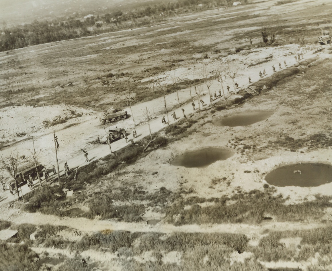 One-Way Traffic – to the Front, 5/23/1944. Esperia, Italy – French infantrymen of the Allied Fifth Army, (left, foreground), march along a road toward Esperia ahead of a long line of Fifth Army vehicles, after the Allies had smashed through the Gustav Line in Italy. Today, Americans on the Anzio beachhead began a smashing offensive synchronized with a renewed attack on the Hitler Line by troops of the Fifth and Eighth Armies. Credit: (ACME Photo by Charles Seawood for the War Picture Pool);