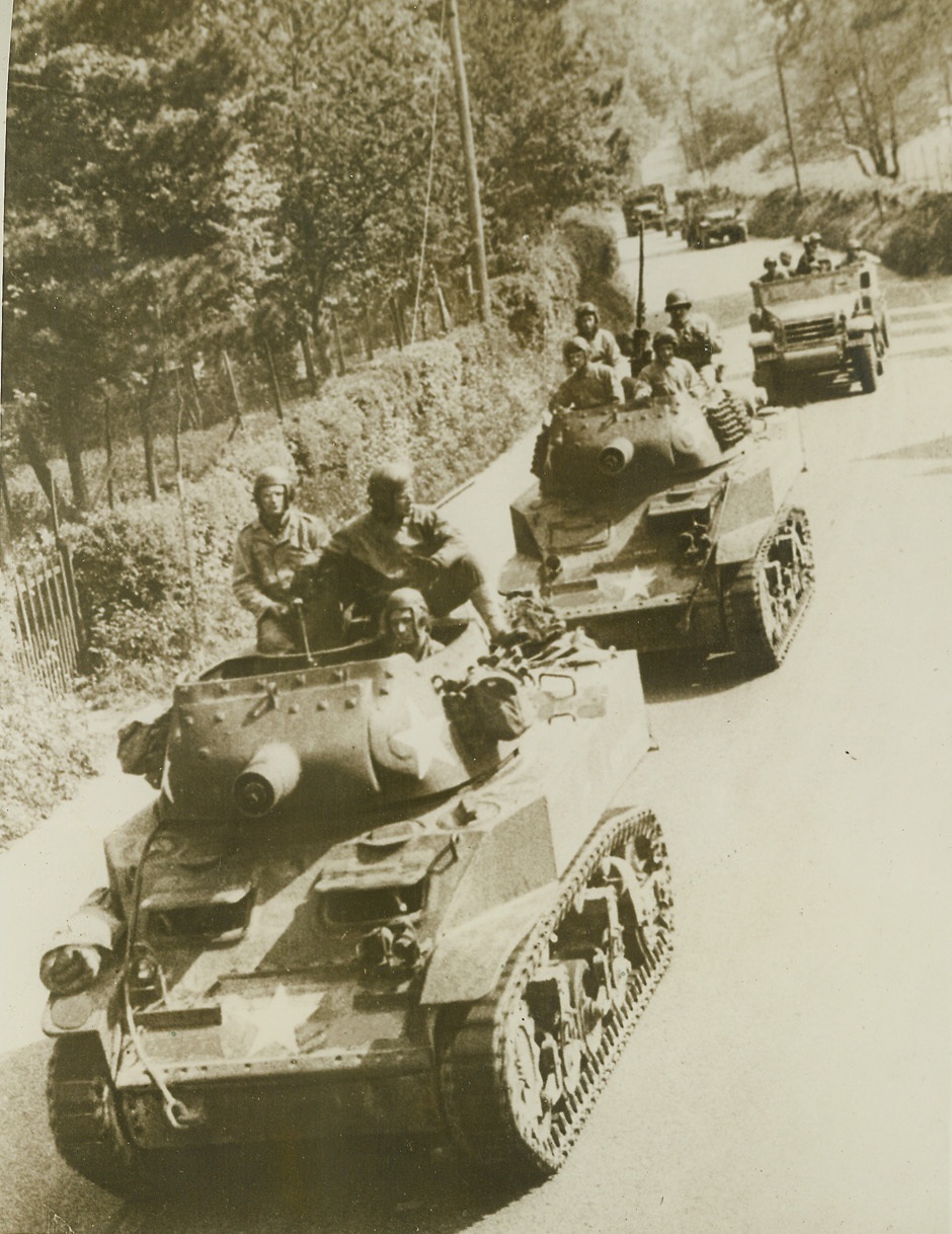 ABANDONED IN FLIGHT, 5/30/1944. CORI, ITALY—Yank infantrymen, advancing into Cori after the German evacuation, pause on the road to examine two knocked out Nazi “Tiger” tanks. Fleeing desperately with the Allies on their heels, the enemy forces left behind volumes of equipment in all stages of disrepair. Allied armies have continued their advance toward Rome, and latest reports state that at least three drives have cut into Nazi defenses in the Alban Hills sector. Credit: Signal Corps Radiotelephoto from Acme;