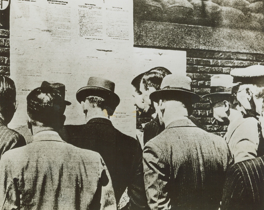 Holland Tense as “D” Day Nears, 5/26/1944. HOLLAND—Their expressions unreadable, these Dutch-men in occupied Holland flock to read the Latest Nazi decrees. This photo, just received from England, is a good example of the prevailing tenseness in Western Europe as “D” day, and the day of their liberation nears. Credit: ACME.;