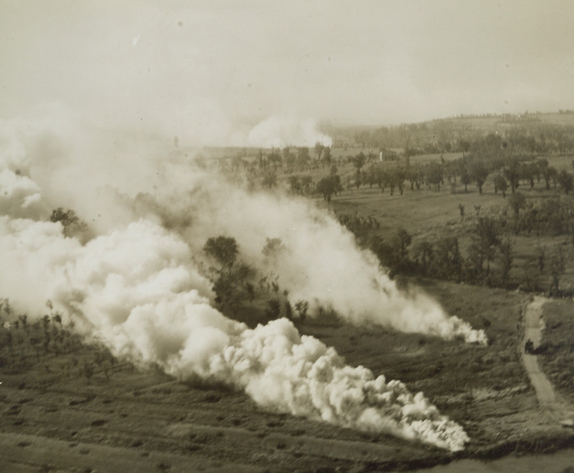Where Rivers and Fighters Meet, 5/25/1944. ITALY—The junction of the Rapido, Liri, and Garigliano Rivers in Italy is screened by smoke pots after a bitter duel by German and Allied troops fighting in the area. With the opening of the new drive from the Anzio beachhead, the Allies are set for the final battle for Rome. Credit: ACME PHOTO BY CHARLES SEAWOOD, WAR POOL CORRESPONDENT.;