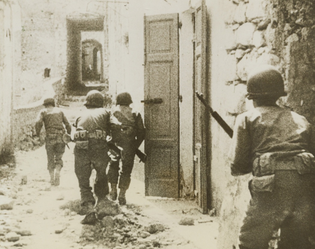 AND ONE WAS HIT (#1), 5/17/1944. ITALY—This is the first photo in a dramatic sequence made in an unnamed Italian village as three U.S. scouts fought a building-to-building scrap against entrenched Nazis. Here the trio moves cautiously down the street as a fourth scout watches them go and is prepared to cover the rear.Credit: Signal Corps newsreel photo from Acme;