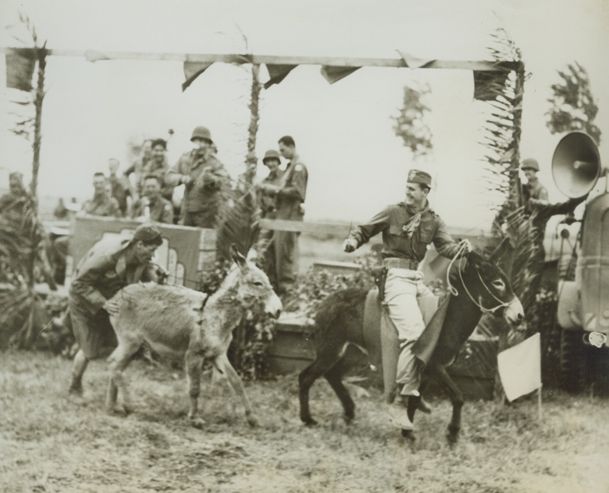 THE WINNAH—WHICH ONE?, 5/20/1944. ANZIO, ITALY—This poor little donkey certainly lives up to his other name. He did all the running in the Donkey Handicap, but stands calmly by as his rider, Pvt. Daniel L. Cason, of St. Joseph, Mo., dons the winner’s horseshoe. Pvt. Cason rode his bonny bray to victory in the handicap which was part of the rodeo staged by men of the 5th Army on the Anzio beachhead.Credit: Acme;