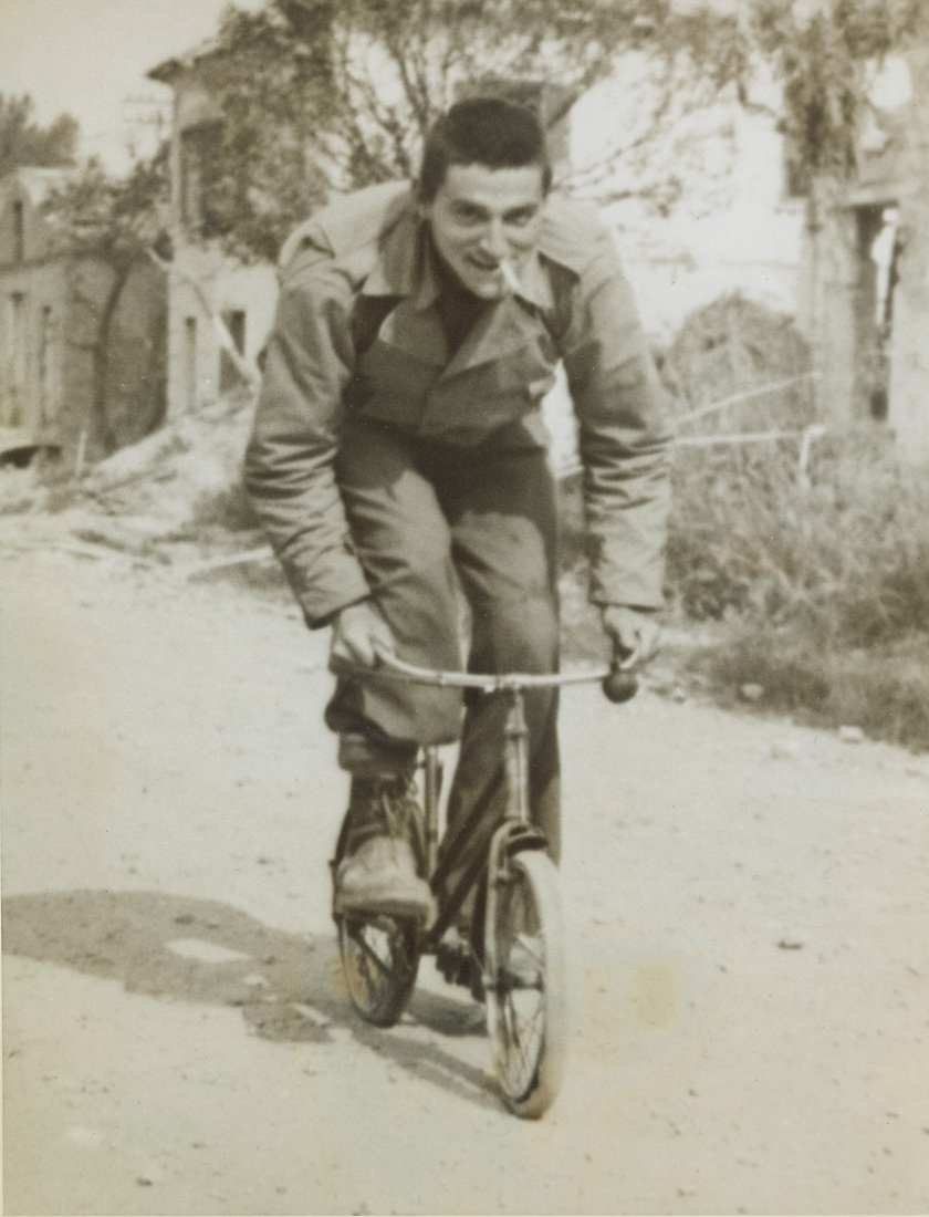A BICYCLE BUILT—NOT FOR HIM, 5/29/1944. SCAURI, ITALY—Trundling along at snail’s pace on this diminutive two-wheeler, Cpl. Jim Ross, of Wilkinsburg, Pa., doesn’t seem at all bothered by the fact that he is joy-riding only 1,500 yards from the front lines. Cpl. Ross found the child’s bike when the American troops took Scauri in the current Allied offensive drive in Italy.Credit: Acme;