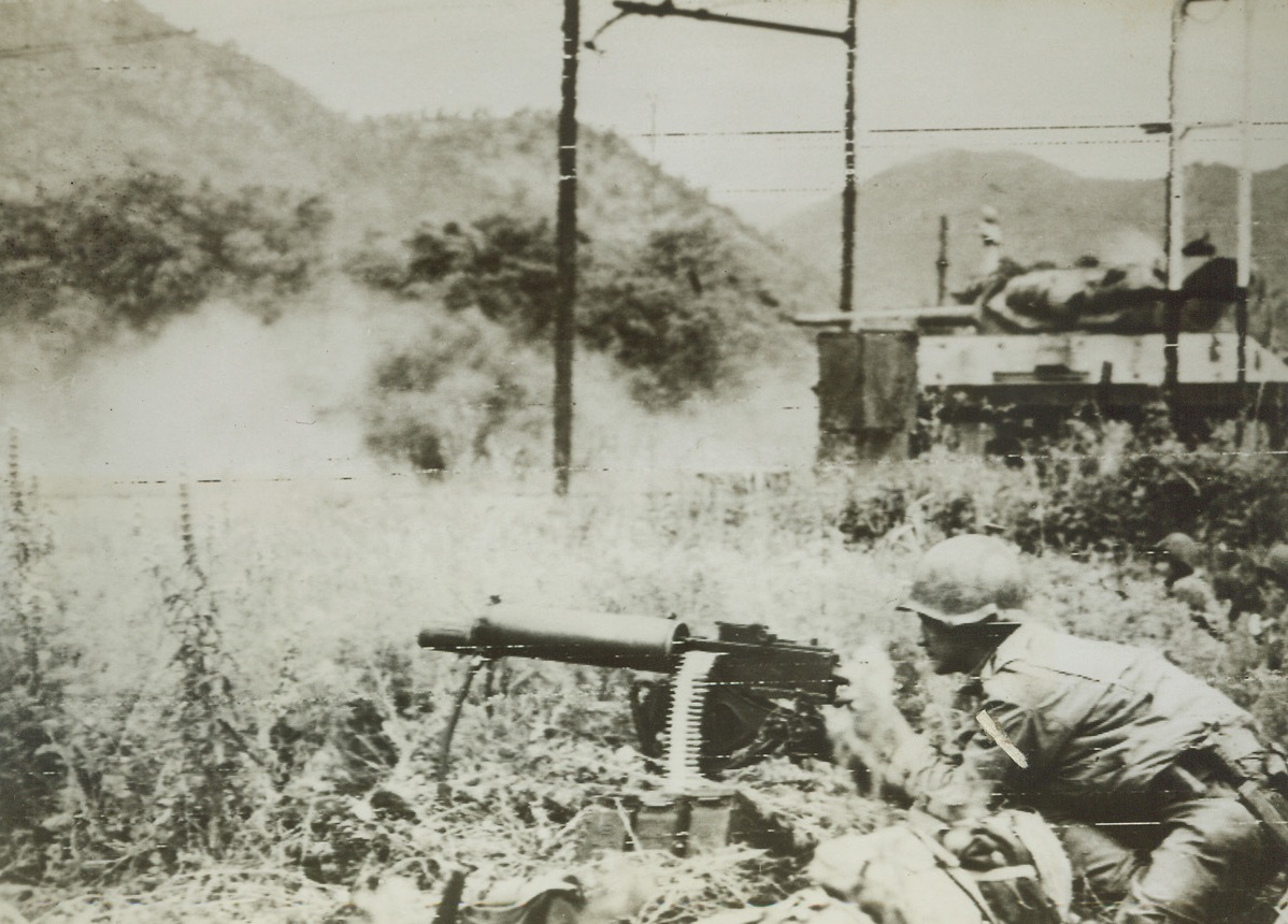 BOTTLING UP THE GERMANS, 5/25/1944. FONDI, ITALY—A M-10 tank destroyer of the American forces fighting with the Allied Fifth Army near Fondi, slams heavy shells into the Mont Orso Tunnel along the west coast electric rail line where Germans were trapped by the Yanks. An American machine gunner, (foreground), helps to blast the enemy out of their hole. Today, American forces driving south from the Anzio beachhead formed a juncture with other U.S. troops heading north from captured Terracina, at Lake Fogliano. Credit: Army Radiotelephoto from Acme