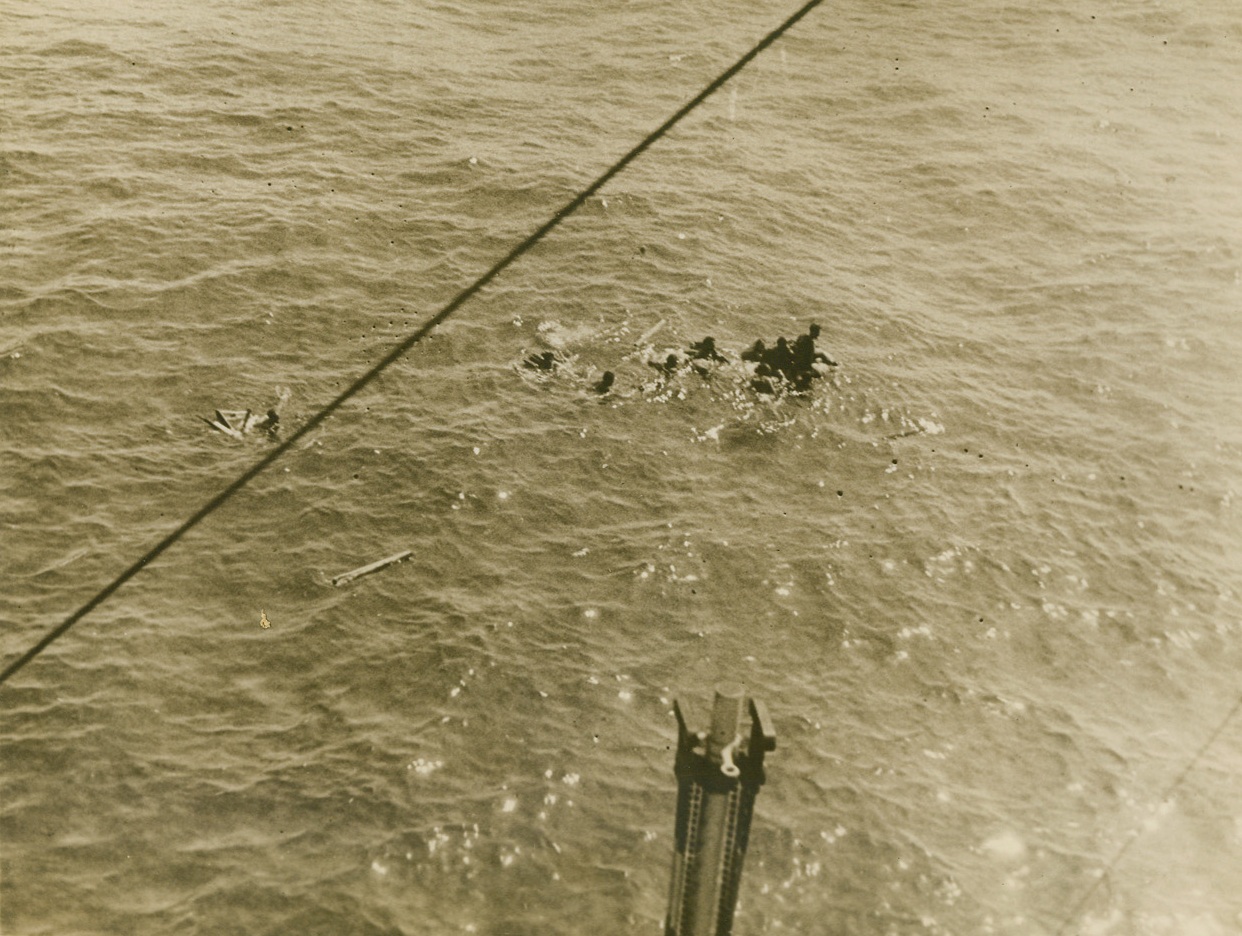 ITALIAN SAILORS IN MEDITERRANEAN, 9/9/1940 ON THE MEDITERRANEAN SEA – Italian sailors cling to wreckage just before rescue. These men were members of the crew of the Italian cruiser, Bartolomeo Colleoni, world’s fastest cruiser, which was sunk by the Australian cruiser Sydney in an engagement in the Mediterranean Sea early this summer. Credit Line (ACME);