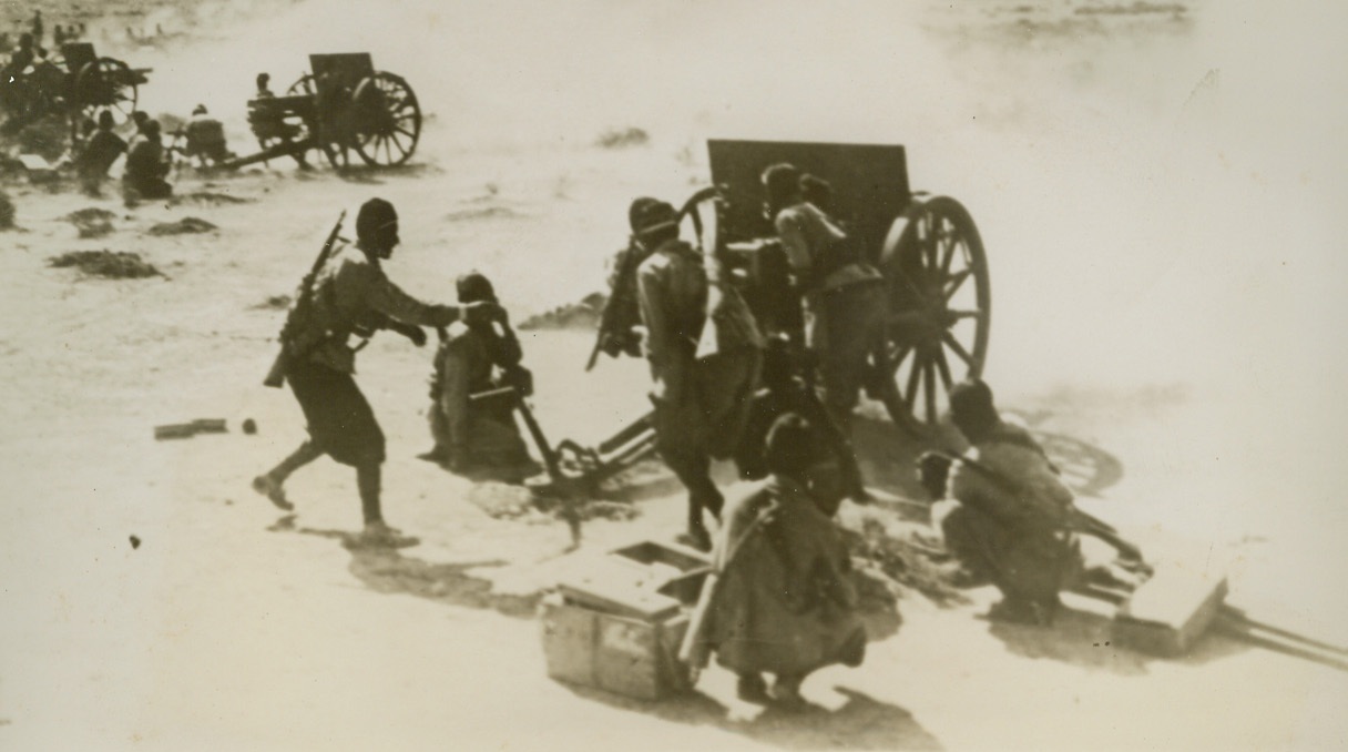 Libyan Barrage, 9/23/1940 Libya – Italian native artillery in action in Libya. A recent report states that the Italian troops that advanced into Egypt from Libya filled the town of Sidi Barrani, Egypt, when it was blown to bits by land mines set off by retreating British. Credit Line (ACME);