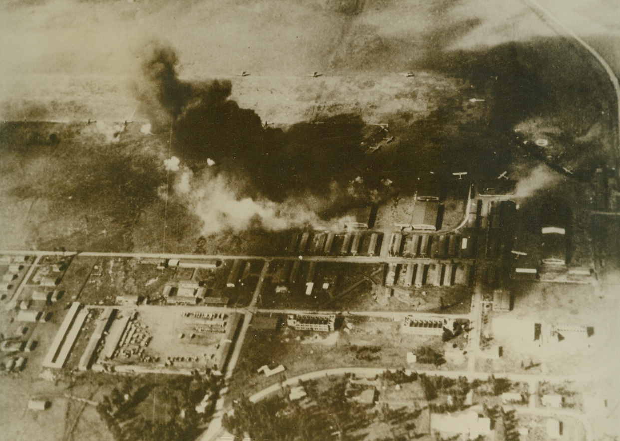 The Bombing of Ethiopian Capital, 9/30/1940 Addis Ababa – – This is the official photograph of a royal Air Force raid on the military airfield at Addis Ababa, capital of Ethiopia. The official R.A.F. communiqué issued at the time stated that direct hits were registered on four hangars and that a gasoline fire was started. Credit line (ACME);