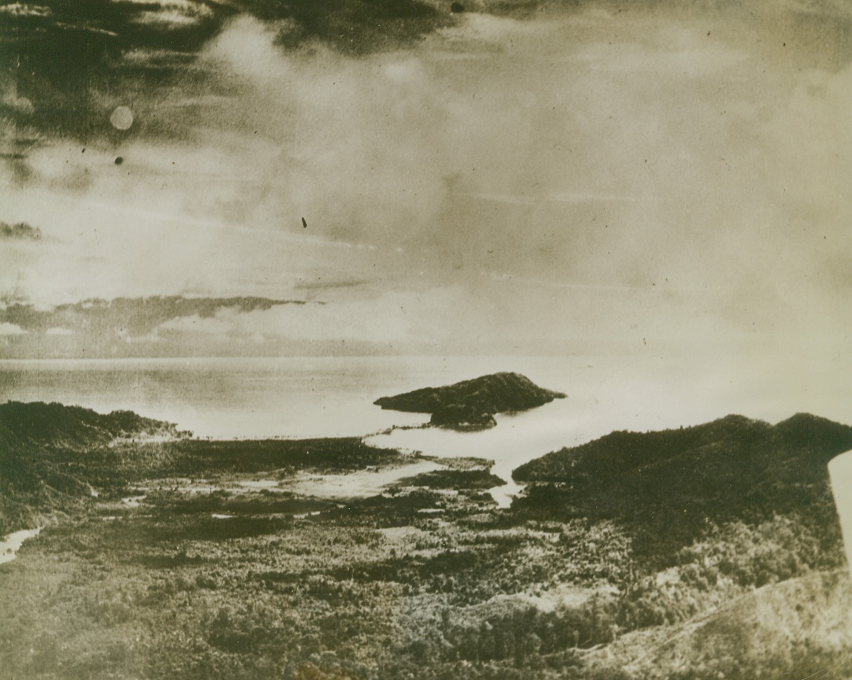 SALAMAUA AIRFIELD, 9/5/1943, NEW GUINEA—Here is an aerial view of the Jap-held airbase at Salamaua, 25 miles south of Lae, on the northeast coast of New Guinea. Allied forces launched a land, sea, and air attack on Lae this morning (Sept. 5th), cutting off the Salamaua base, which is rapidly being encircled. Photo made from an American Army Air Forces plane. Credit: U.S. Army Air Forces photo from Acme;