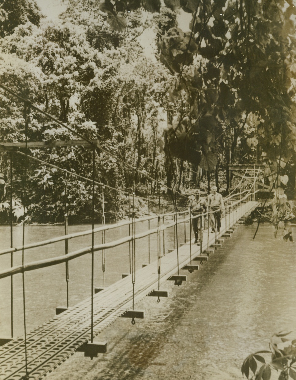 Bridge The Seabees Built, 9/29/1943. The Navy’s Seabees built this bridge across Matanikau, following the battle of Manitanikao River. The bridge enabled Marine Corps assault troops, plus small supply units, to make hurried crossings and reinforce units already in enemy territory. The bridge is constructed of steel matting, the same kind used on the runway of Guadalcanal’s Henderson Field. 9/29/43 Credit Line (U.S. Marine Corps Photo From ACME);