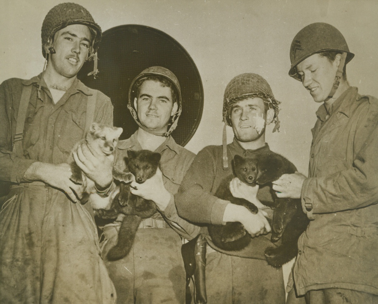 NOT FOXY ENOUGH, 9/13/1943. Four soldiers who participated in the Allied invasion of Jap-deserted Kiska Island hold four baby blue foxes they found in a hole in rocks on Segula, a small island a short distance from Kiska. The foxes weren’t foxy enough to avoid capture. The men are (L-R) Sgt. Marshall B. Brooks, of Shreveport, La.; Ray Burton, a Canadian soldier from Richmond Hill, Ontario, Canada; Sgt. Robert G. Johnson, of Bloominton, Ind.; and Sgt. Herman W. Grae, of San Antonio, Tex. The foxes were named Winken, Blinken, Stinken, and Nod.Credit: Acme;