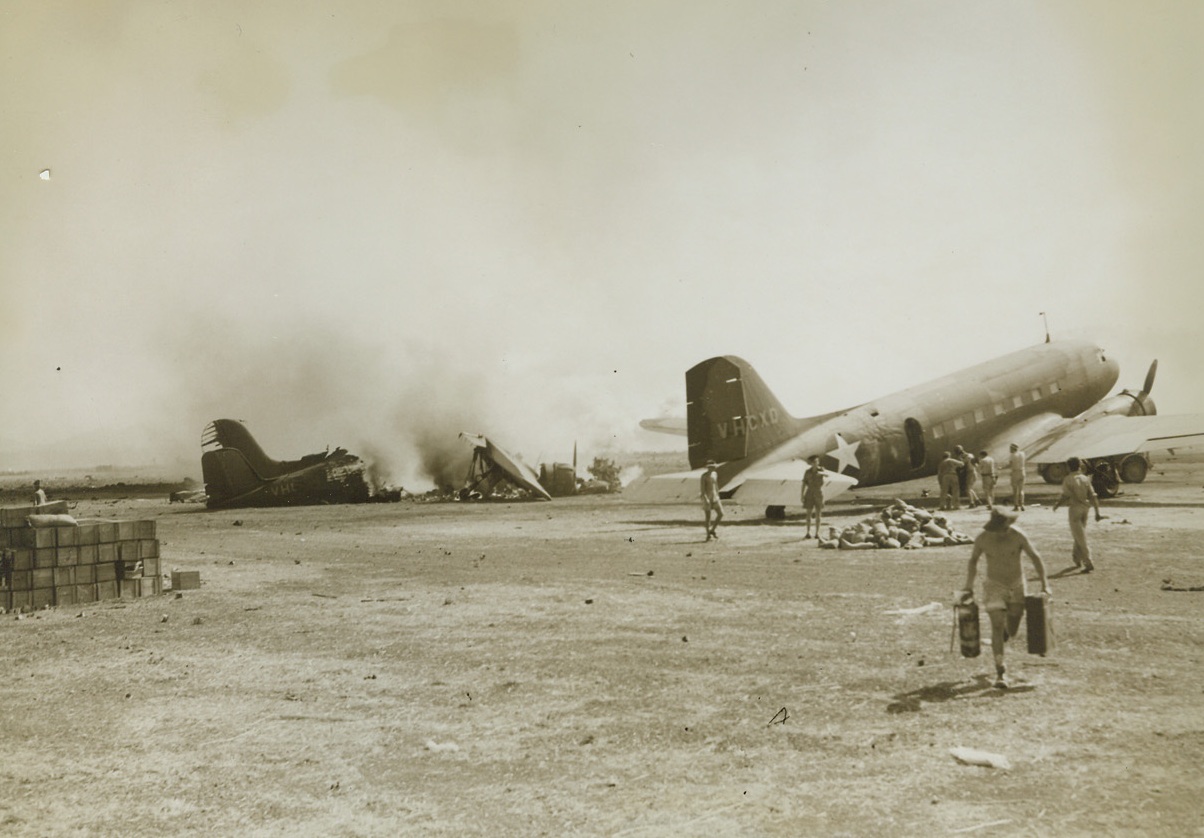 JAPS STRIKE FROM AIR, 9/14/1943. PORT MORESBY—A Jap bombing mission on the airport at Port Moresby, New Guinea, back in 1942 proved somewhat successful, jutting from the broken plane in background. While it burns unattended, ground men are fighting a fire inside the plane at right. The Australian soldier running toward the camera is carrying cans in which to get water. This picture has just been released by the War Department. Credit: ACME PHOTO BY FRANK PRIST, JR., CAMERAMAN FOR THE WAR POOL.;