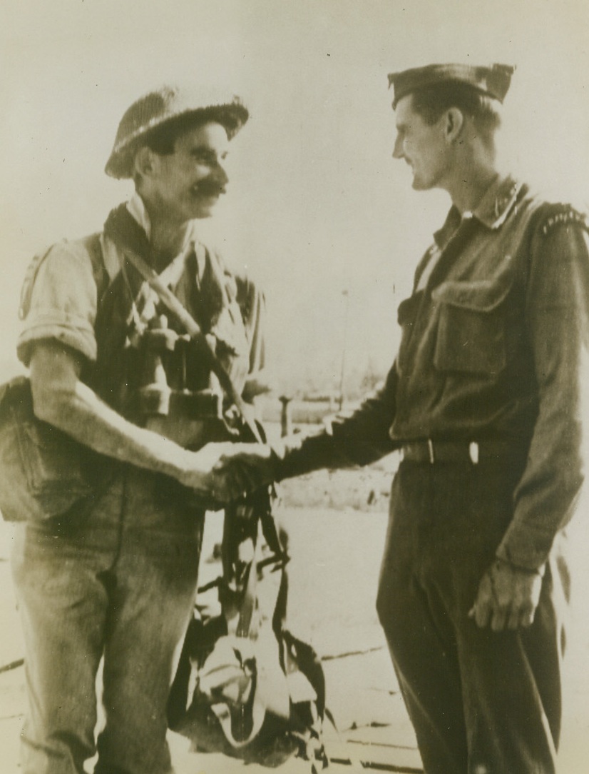 GOOD LUCK, PAL, 9/10/1943. SICILY—An American Ranger shakes hands with a British Commando, just before the two specialist fighters leave a Sicilian port and set out for Italy. Each of these Allied soldiers knows what the other is up against, for both do the same sort of rough-and-tumble fighting.Credit: Acme photo via U.S. Army Signal Corps radiotelephoto;