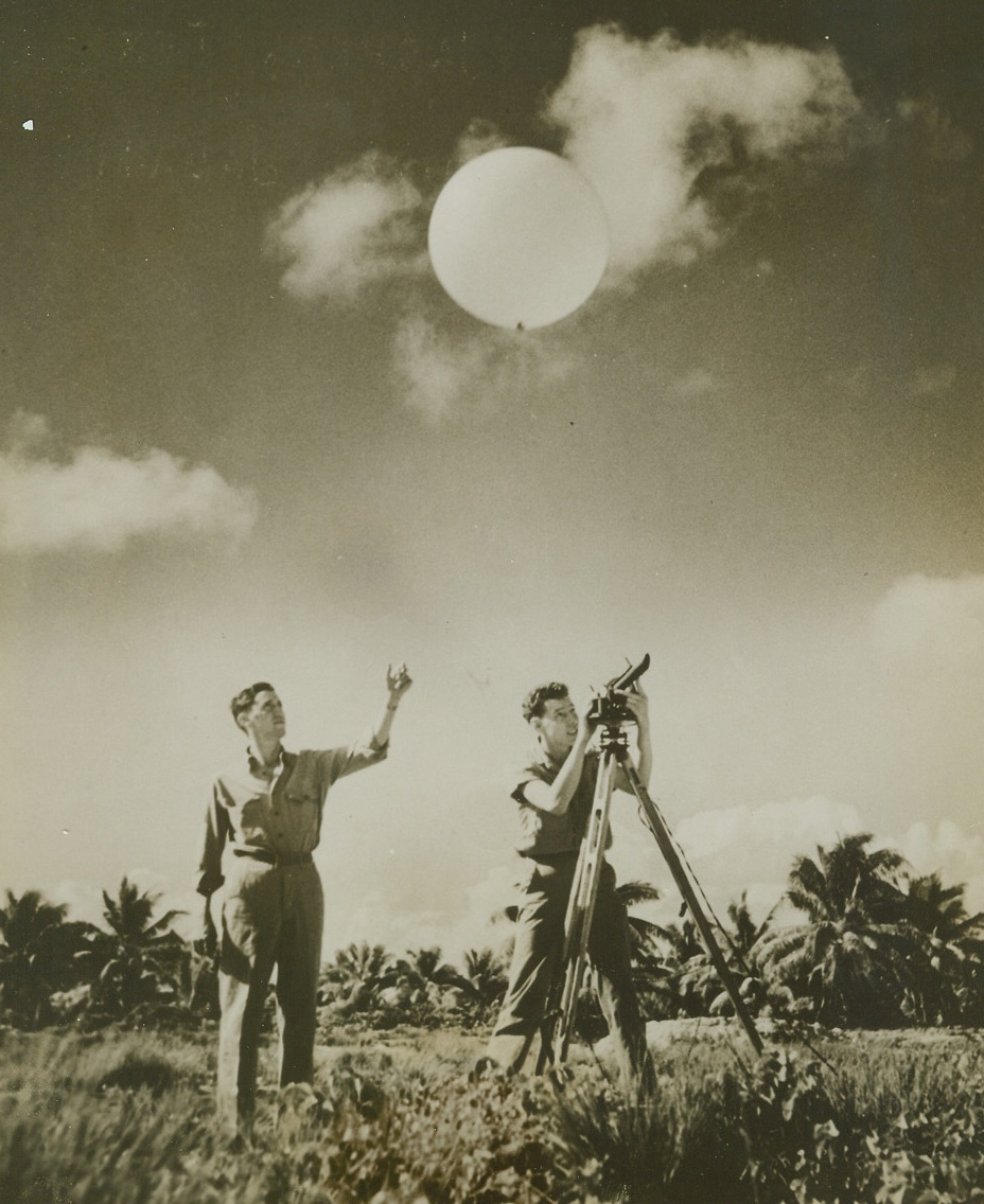 TESTING WINDS, 9/16/1943. CENTRAL PACIFIC—Two Seventh Air Force weathermen, stationed at an island air field in the Central Pacific, release a hydrogen-filled balloon to test winds. Sending the balloon aloft are: Cpl. William H. Allen (left) of Jasper, Texas, and Pfc. Howard C. Luke of Long Island, NY.Credit: ACME;