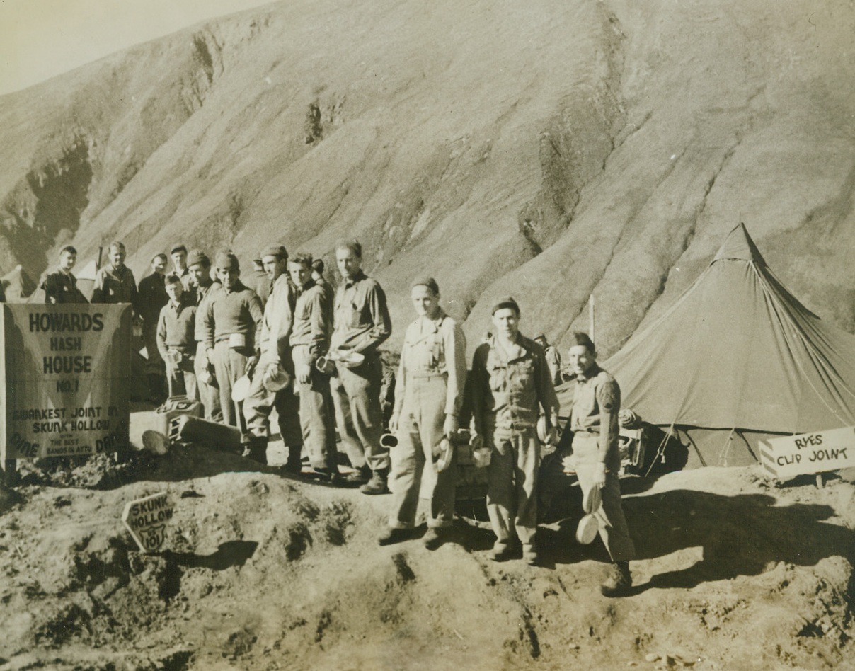 Swank Attu Eatery, 9/26/1943. Attu – Wherever American soldiers are stationed humorous signs are sure to pop up – and that’s a sure sign of good moral. Here a sign in front of the mess tent proclaims that it is “Howards Hash House No. 1, Swankest Joint in Skunk Hollow – Dine, Dance with the best bands in Attu.” The barbershop is named “Rye’s Clip Joint” and an official-looking sign lets you know that Skunk Hollow is on U.S. 101. This is one of the first pictures to show in detail operations of U.S. troops on Attu since last May when we drove the Japs out of the island that is more than halfway across the Pacific toward Tokyo. Credit: Official US Army Engineers photo from ACME;