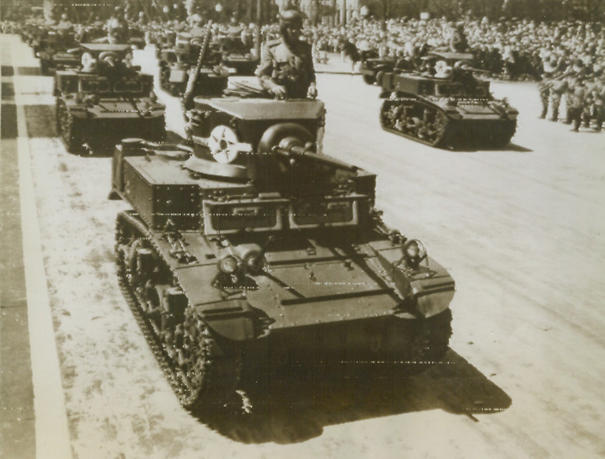 Brazil Celebrates 122 Years of Independence, 9/7/1943. Rio de Janeiro—Twenty-eight ton tanks of a Brazilian mechanized division pass the Ministry of War building in Rio de Janeiro during the giant parade of 50,000 troops to celebrate the nation’s Independence Day. This photo is one of the first to be transmitted over the direct radio-photo service between Rio and New York just opened by the Mackay Radio and Telegraph Corporation.Credit: ACME radiophoto.;