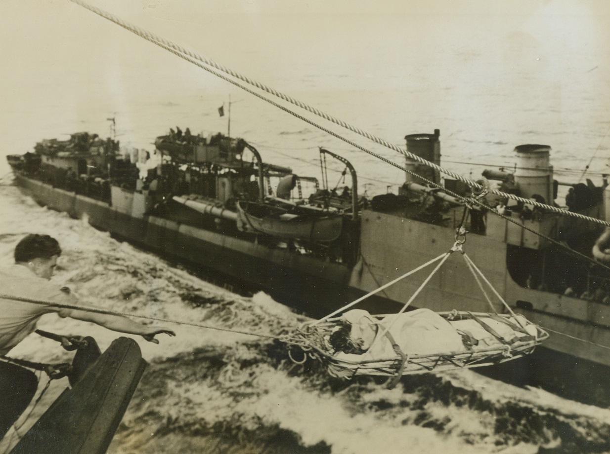 U.S. Navy Plane Downs 3 Nazi Subs, 9/28/1943. WASHINGTON, D.C. – One, lone U.S. Navy Grumman Avenger (TBF) Torpedo Bomber flying from an escort carrier in the Atlantic, has made history by definitely sinking 3 Nazi U-Boats in 4 days and damaging another, according to announcement in Washington today. Lt. Robert P. Williams, USNR, and his two-man crew not only escaped unscathed in the attacks, but produced excellent pictoral evidence of the “kills”. Here, the captain of one of the Nazi subs blaskted by Lt. Williams’ plane, and who was wounded in the attack, is transferred aboard the escort carrier from the destroyer that rescued him. Approximately 30 survivors were picked up.;