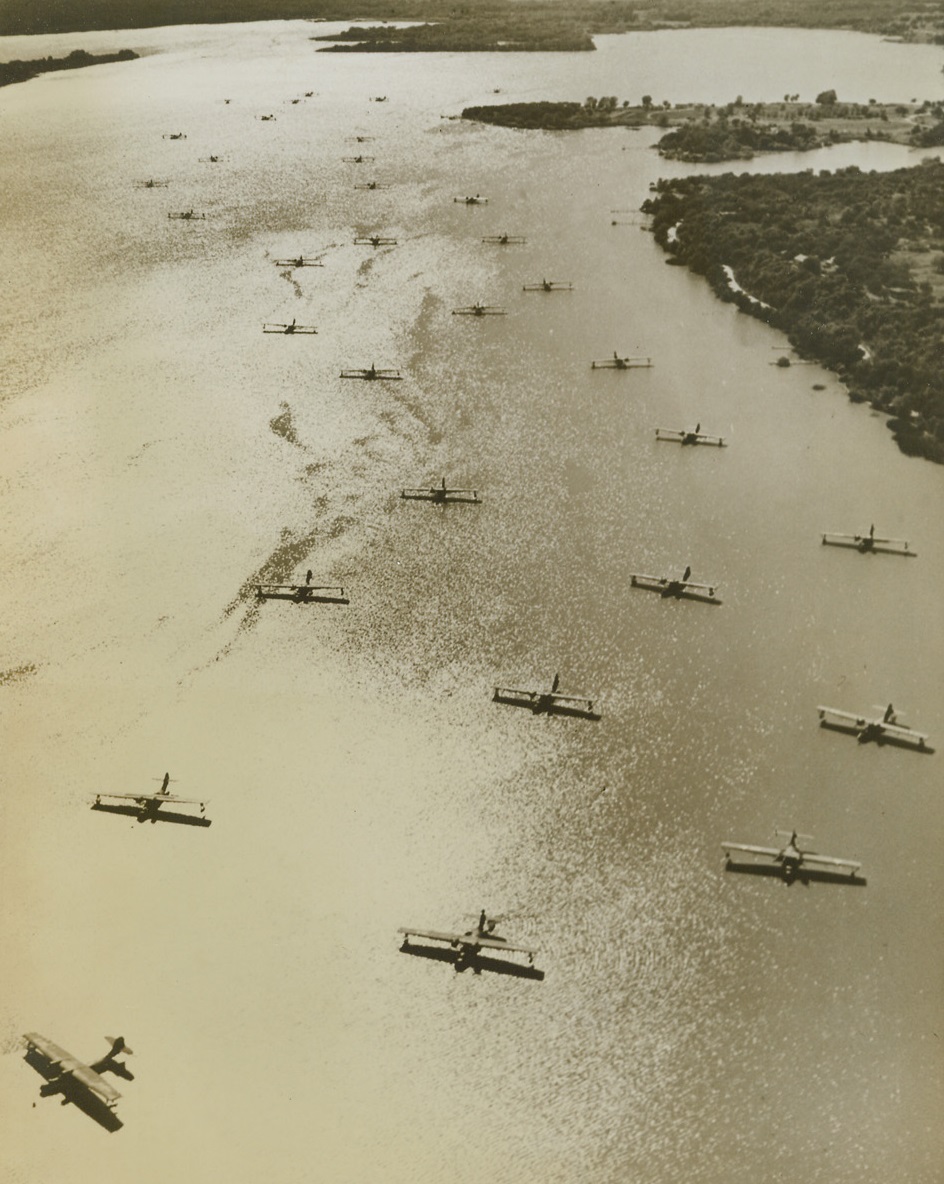 Storm Brewing, 9/28/1943. Fort Worth, Texas – More than thirty Navy PBY Catalina Flying Boats seek refuge from a threatening Gulf Coast storm, landing near Consolidated Vultee’s Fort Worth Plant which turns out Liberator Bombers and Liberator Express Transports. These planes, which appear to be resting on a sheet of silver, are known as the “workhorses” of the Navy. 9/28/43 Credit Line (ACME);