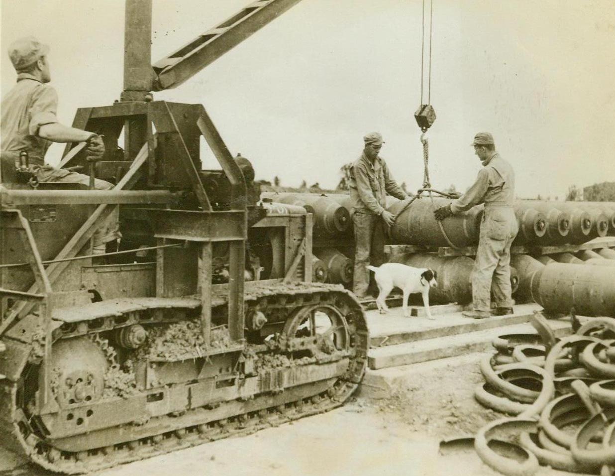 Preparations For A Raid, 9/19/1943. Somewhere In England – Destined to mess up enemy territory, these bombs are picked up by a tractor that will place them in a loading wagon. The deadly missiles will soon travel over Europe in the bomb racks of B-26 Marauders. The white pup “assisting” in operations is one of the mascots at this U.S. Marauder Base in England. Credit: ACME;