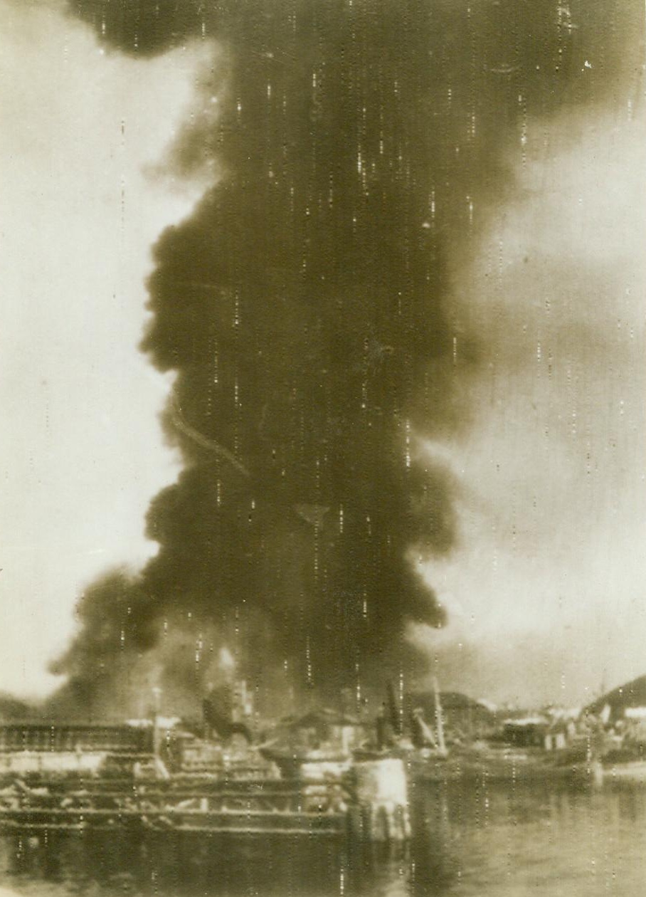 ALLIES SMACK TRONDHEIM, 9/14/1943. New York: — Black smoke billows skyward from a blazing German oiltank three minutes after the first bomb dropped on Trondheim’s “new harbor” during a big Allied day raid on the Norwegian port on July 24. Photo was radioed from Stockholm to New York Today (Sept. 14). Credit (ACME Radiophoto);
