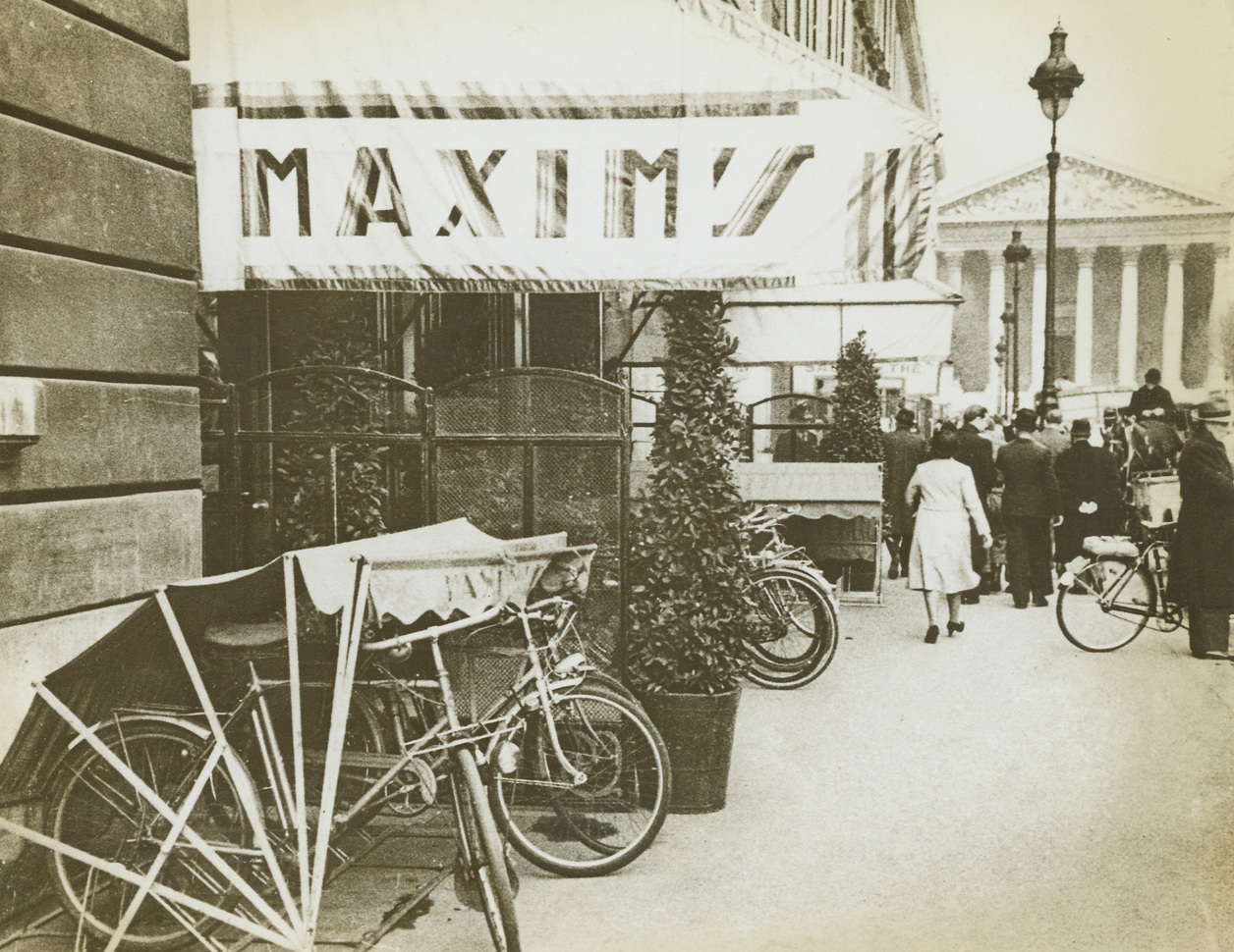 ”I’m Going to Maxim’s” – On a Bicycle, 9/2/1943. Paris – Parisians have almost forgotten what it was like to drive around in motor cars. They get along as best they can with bicycles and horse-drawn vehicles. Typical is this bicycle garage in front of Maxim’s, the night club made famous in story and song. Credit: ACME;