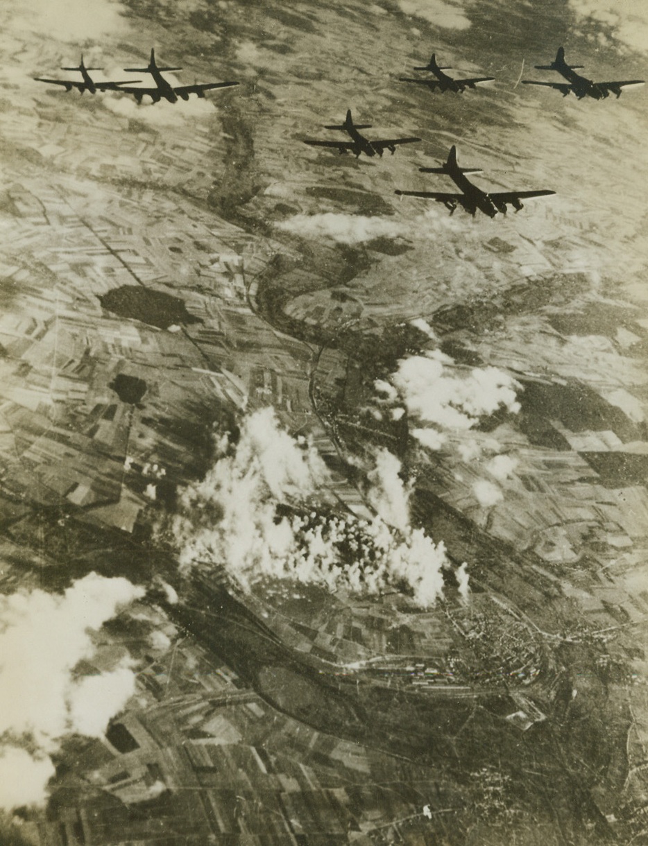 “Forts” Blast Nazi Airfield in France, 9/16/1943. In this photo, probably the most perfect view of bombing from the air yet produced, a formation of Flying Fortresses of the U.S. Army 8th Air Force, is shown over the Nazi-held airfield at Amiens-Glisy, France, during a raid on the important German fighter base last Aug. 31st. The boundaries of the base are clearly marked by columns of smoke from exploding bombs dropped by the American “Forts”. Allied air forces based in Britain, are concentrating heavily on the invasion coast and on aircraft factories and airfields in France, in recent raids. This may by the “softening-up” prelude to invasion. (Passed by Censors) Credit: ACME;
