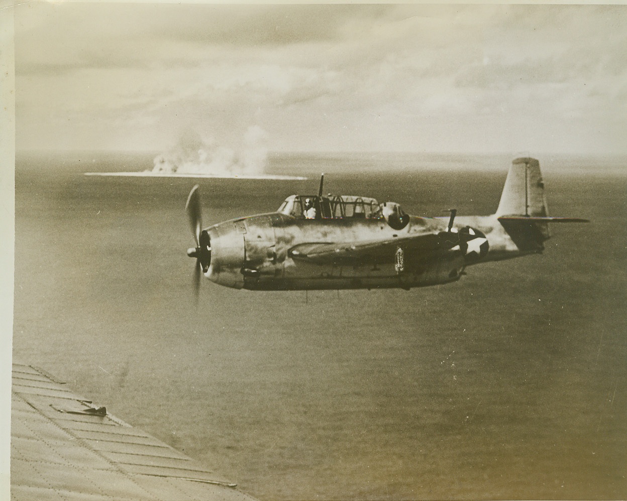 Navy Blasts Marcus Island, 9/28/1943. Smoke from burning Japanese installations covers tiny Marcus Island as a Grumman Avenger torpedo bomber, which has just dropped its load on the enemy base, returns to its carrier. The Japanese island base, 990 miles southeast of Tokyo, was attacked by a U.S. Navy task force on September 1, 1943, and 80% of the enemy installations were reported destroyed. Credit: (U.S. Navy Official Photo from ACME);