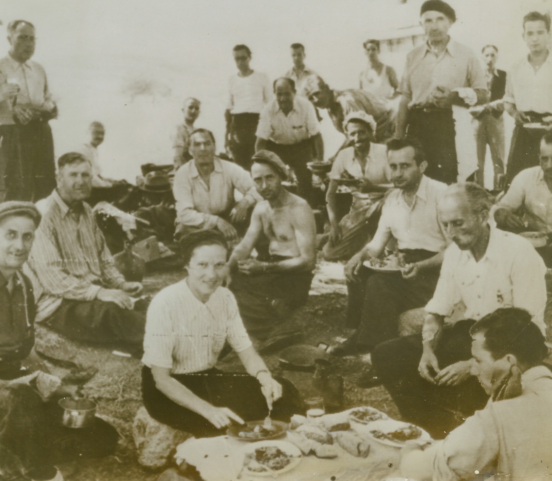Freedom Picnic for Corsicans, 9/22/1943. This photo, flashed to New York by radio today, shows a group of French Corsicans as they enjoyed their first meal in Italy after their liberation from Axis captors by the Allied invasion. Today it was announced that U.S. Rangers had joined French commando troops in mopping up the remaining German forces in Corsica. (A British Army film unit photo). Credit: OWI radiophoto from ACME.;